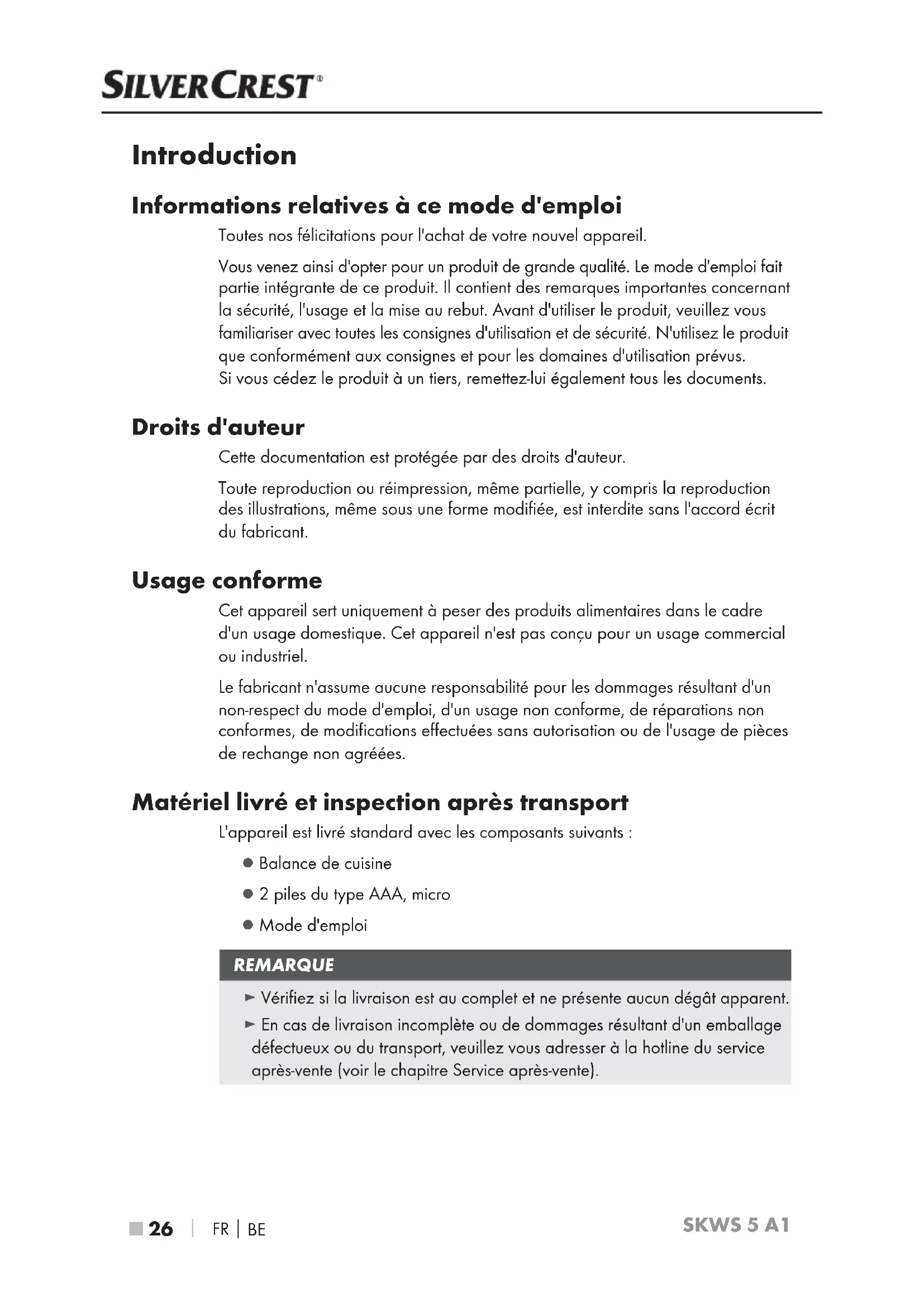 SKWS 5 A1 Introduction Informations relatives à ce mode d'emploi Toutes nos félicitations pour l'achat de votre nouvel appareil. Vous venez ainsi d'opter pour un produit de grande qualité. Le mode d'emploi fait partie intégrante de ce produit. Il contient des remarques importantes concernant la sécurité, l'usage et la mise au rebut. Avant d'utiliser le produit, veuillez vous familiariser avec toutes les consignes d'utilisation et de sécurité. N'utilisez le produit que conformément aux consignes et pour les domaines d'utilisation prévus. Si vous cédez le produit à un tiers, remettez-lui également tous les documents. Droits d'auteur Cette documentation est protégée par des droits d'auteur. Toute reproduction ou réimpression, même partielle, y compris la reproduction des illustrations, même sous une forme modifiée, est interdite sans l'accord écrit du fabricant. Usage conforme Cet appareil sert uniquement à peser des produits alimentaires dans le cadre d'un usage domestique. Cet appareil n'est pas conçu pour un usage commercial ou industriel. Le fabricant n'assume aucune responsabilité pour les dommages résultant d'un non-respect du mode d'emploi, d'un usage non conforme, de réparations non conformes, de modifications effectuées sans autorisation ou de l'usage de pièces de rechange non agréées. Matériel livré et inspection après transport L'appareil est livré standard avec les composants suivants: ● Balance de cuisine ● 2 piles du type AAA, micro ● Mode d'emploi REMARQUE ► Vérifiez si la livraison est au complet et ne présente aucun dégât apparent. ► En cas de livraison incomplète ou de dommages résultant d'un emballage défectueux ou du transport, veuillez vous adresser à la hotline du service après-vente (voir le chapitre Service après-vente).FR
