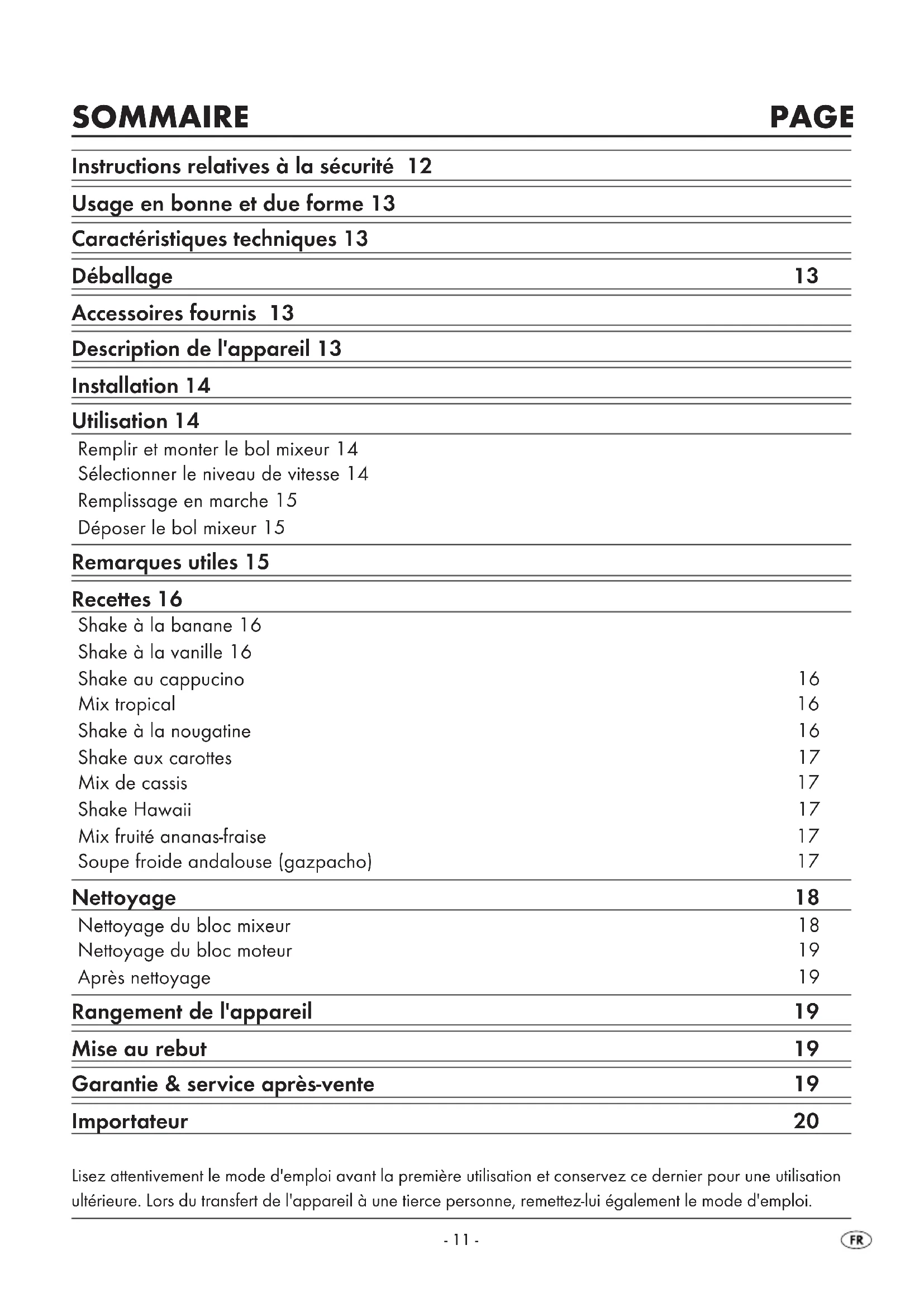 - Nettoyez soigneusement tous les composants avant le premier usage du mixeur (voir « Nettoyage ») Accessoires fournis Vérifiez après déballage que toutes les pièces sont fournies. Les accessoires fournis sont les suivants : 1 x bloc moteur avec cordon d'alimentation et fiche secteur 1 x bol mixeur avec le couteau monté 1 x couvercle 1 x bouchon doseur 1 x Mode d'emploi Description de l'appareil
