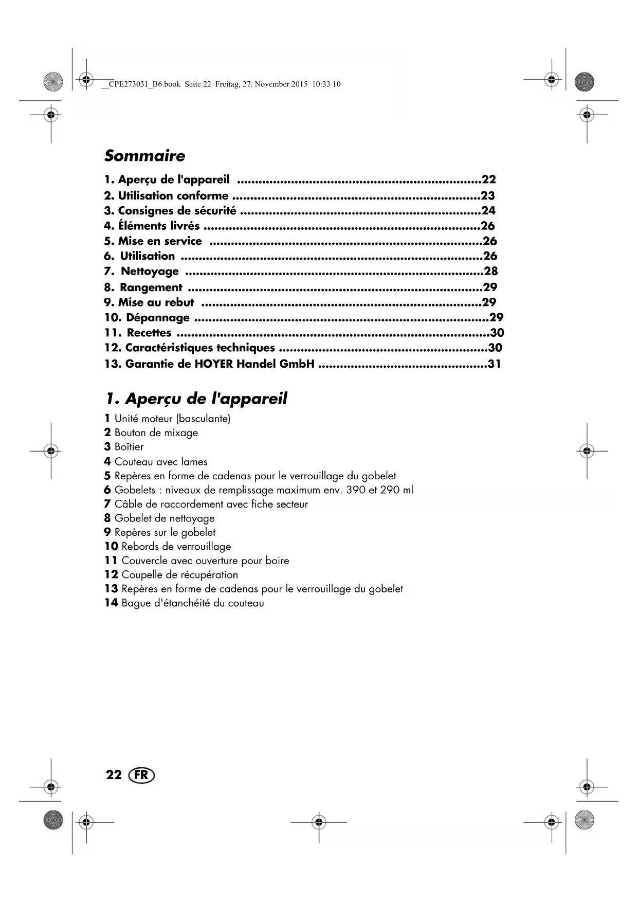 1 Unité moteur (basculante) 2 Bouton de mixage 3 Boîtier 4 Couteau avec lames 5 Repères en forme de cadenas pour le verrouillage du gobelet 6 Gobelets : niveaux de remplissage maximum env. 390 et 290 ml 7 Câble de raccordement avec fiche secteur 8 Gobelet de nettoyage 9 Repères sur le gobelet 10 Rebords de verrouillage 11 Couvercle avec ouverture pour boire 12 Coupelle de récupération 13 Repères en forme de cadenas pour le verrouillage du gobelet 14 Bague d'étanchéité du couteau