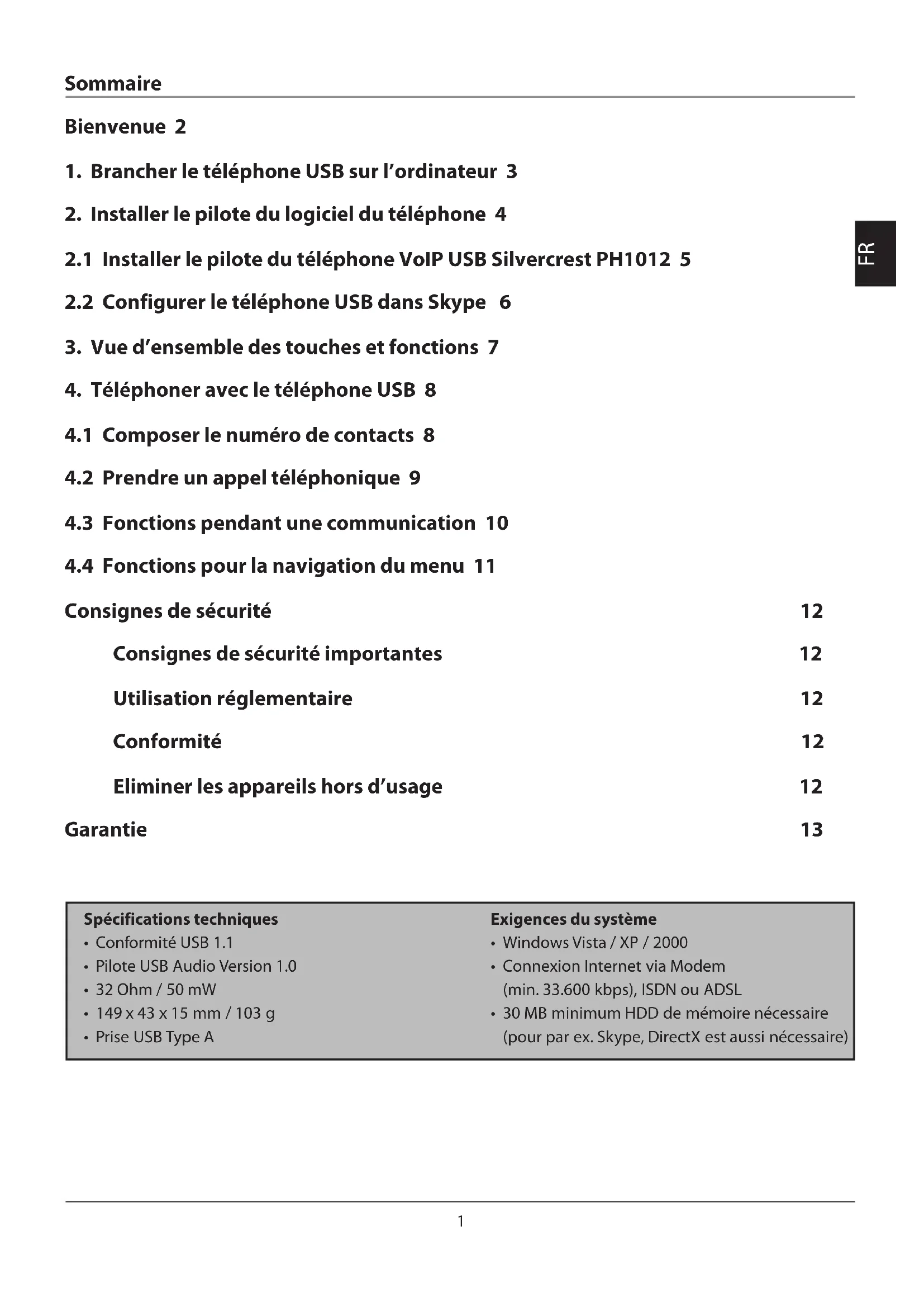 - Prise USB Type A (pour par ex. Skype, DirectX est aussi nécessaire)2 Bienvenue Ce mode d’emploi décrit l’installation et l’utilisation du téléphone VoIP USB Silvercrest PH1012. Le téléphone USB vous permet de faire des appels téléphoniques „Voice over IP“ via Internet tout en profitant du confort d’un téléphone classique. Avant que vous ne puissiez utiliser votre téléphone USB Silvercrest, le logiciel de téléphonie Skype doit être installé sur votre ordinateur. Puis, on peut installer le pilote du téléphone USB de manière à ce qu’il puisse travailler avec le logiciel Skype. Le programme de gestion ci-joint élargit votre logiciel Skype déjà existant des fonctions du téléphone USB ; il n’est cependant pas en lui-même un logiciel de téléphonie. C’est pourquoi nous vous prions de vérifier avant l’installation si le logiciel Skype a été installé en bonne et due forme sur votre ordinateur. Vous devez également être enregistré en tant que client chez Skype, afin de pouvoir l’utiliser pour téléphoner via Internet. Une installation correcte du pilote du téléphone USB ne peut être garantie que dans ce cas. Veuillez suivre les instructions d’installation l’une après l’autre afin d’installer en bonne et due forme votre téléphone USB. Veuillez tenir compte des consignes de sécurité mentionnées à la fin de ce document. Contenu du paquet : – Téléphone USB avec câble de connexion – Câble de rallonge USB – Pilote CD – Manuel3