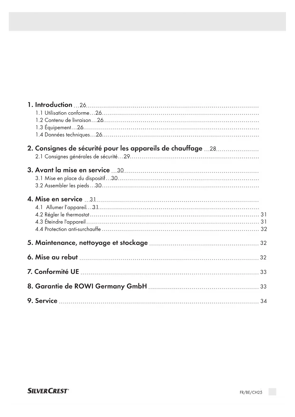 Le chauffage ne doit pas être installé directement sous une prise murale. N’utilisez jamais ce chauffage à proximité d’une baignoire, d’une douche ou d’une piscine. Si le câble d’alimentation de cet appareil est endommagé, il doit être remplacé par le fabricant ou par son service après-vente ou par une personne également qualifiée pour éviter toute mise en danger. ATTENTION : Afin d’éviter tout risque de réinitialisation invo- lontaire du limiteur de température de protection, l’appareil ne doit pas être alimenté par un dispositif de commutation externe tel qu’une minuterie, ni relié à un circuit électrique régulièrement ouvert et fermé à l'aide d'un appareil. Aucune action n'est requise de la part de l'utilisateur pour régler le produit sur 220 ou 240 V. Le produit se règle automatiquement sur la bonne tension. Ne mettez pas en service un appareil ayant subi une chute. Ne pas utiliser en cas de signes visibles d’endommagement sur l’appareil de chauffage. L’appareil de chauffage doit être installé sur un sol solide, plat et horizontal.FR/BE/CH 29
