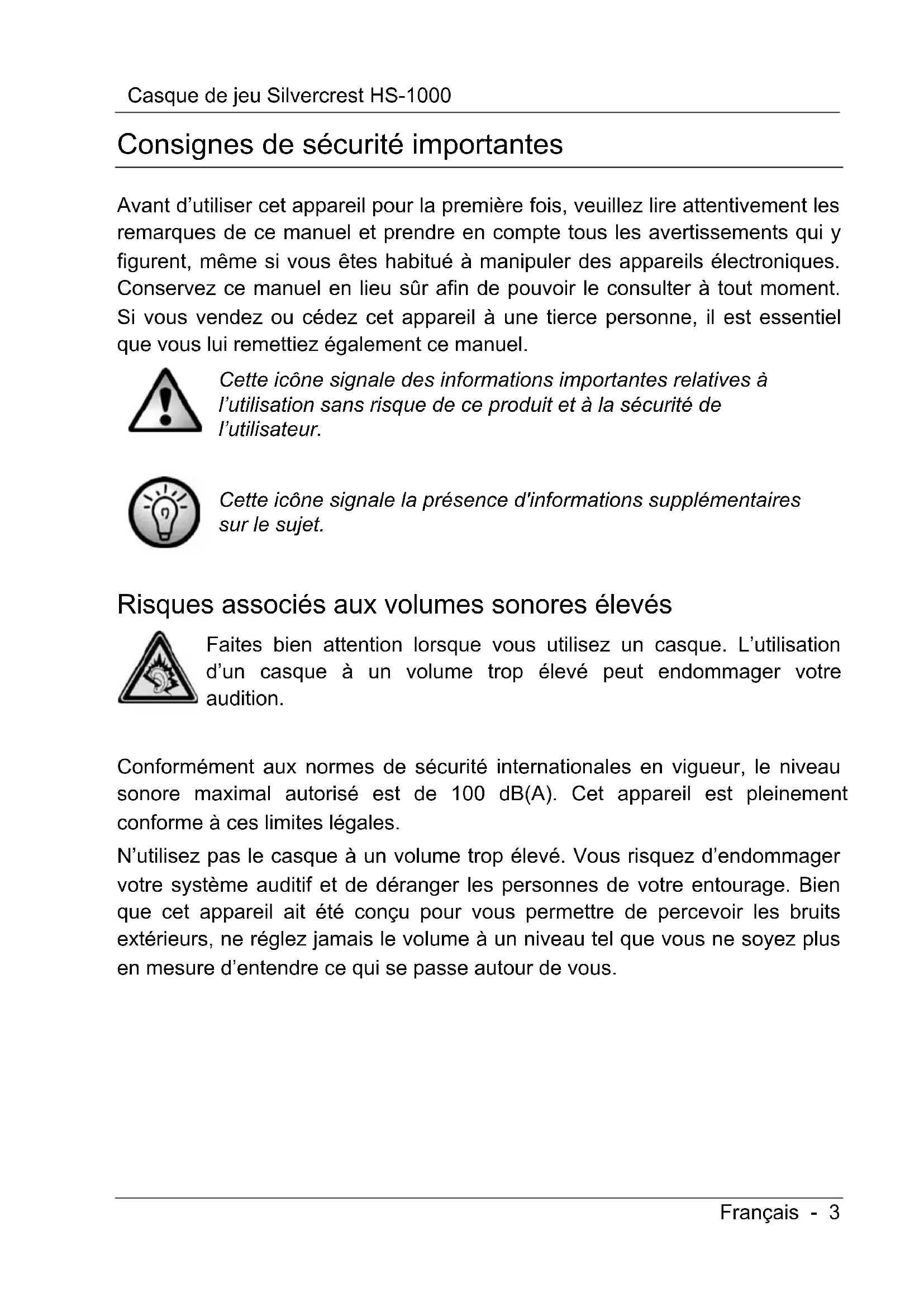 - Informations concernant la garantie Casque de jeu Silvercrest HS-1000 Français - 3 Consignes de sécurité importantes Avant d’utiliser cet appareil pour la première fois, veuillez lire attentivement les remarques de ce manuel et prendre en compte tous les avertissements qui y figurent, même si vous êtes habitué à manipuler des appareils électroniques. Conservez ce manuel en lieu sûr afin de pouvoir le consulter à tout moment. Si vous vendez ou cédez cet appareil à une tierce personne, il est essentiel que vous lui remettiez également ce manuel. Cette icône signale des informations importantes relatives à l’utilisation sans risque de ce produit et à la sécurité de l’utilisateur. p. 19