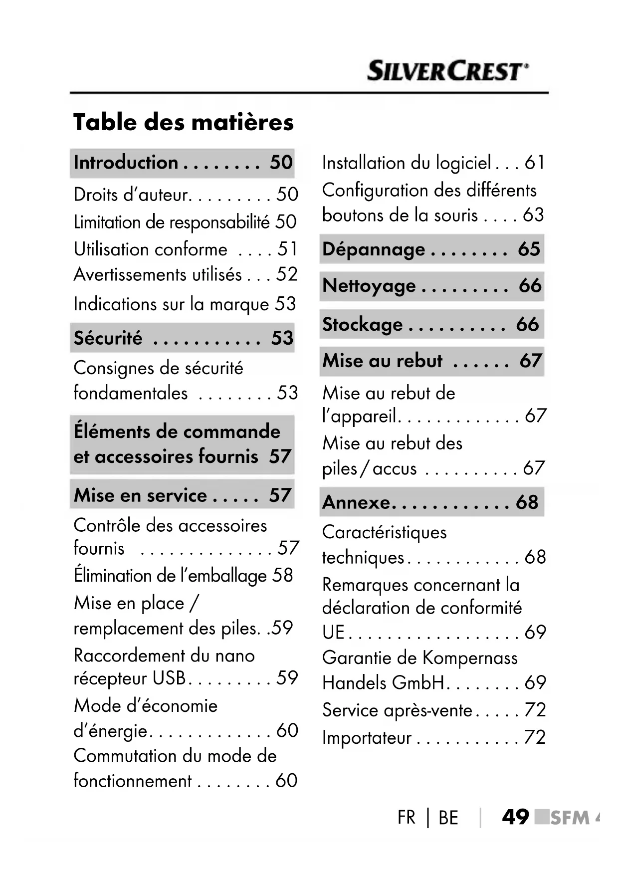 51 ■SFM 4 A1 Les indications, illustrations et descriptions contenues dans le présent mode d’emploi ne peuvent donner droit à aucune réclamation. Le fabricant n’assume aucune responsabilité pour les dommages résultant du non- respect du mode d’emploi, d’une mauvaise utilisation, de réparations inappropriées, de modifications non autorisées ou de l’emploi de pièces de rechange non agréées. Utilisation conforme Cette souris sans fil est un appareil de technologie de l’information et sert d’unité d’entrée pour un ordinateur. L’appareil ne doit pas être utilisé en dehors d’espaces clos. Cet appareil n’est pas conçu pour une utilisation en entreprise ni pour une utilisation professionnelle (telle que les applications bureautiques). Utilisez l’appa- reil exclusivement dans l’habitat pour un usage privé. Tout usage autre ou dépassant ce cadre est réputé non conforme. Toute réclamation visant des dommages issus d’un usage non conforme sera rejetée. L’utilisateur assume seul la responsabilité des risques encourus.■ 52