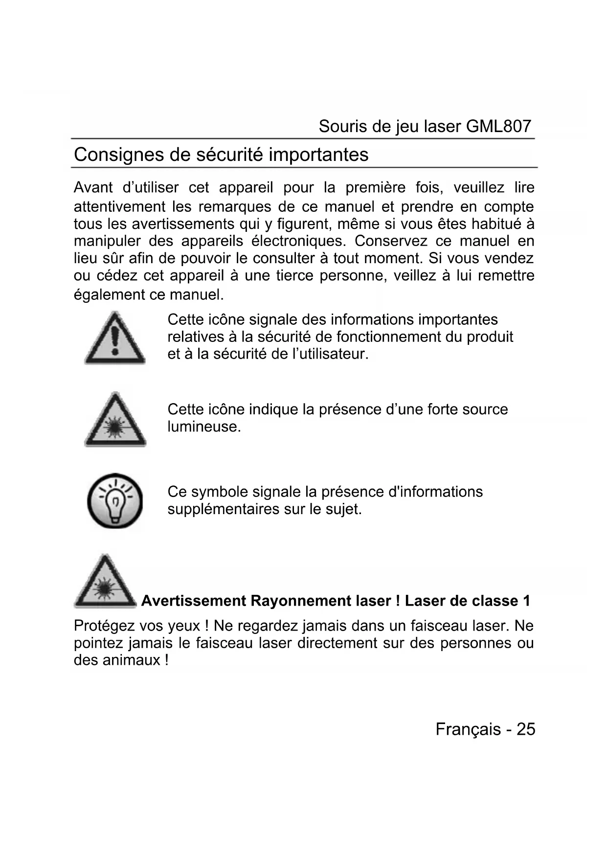 - Garantie Souris de jeu laser GML807 Français - 25 Consignes de sécurité importantes Avant d’utiliser cet appareil pour la première fois, veuillez lire attentivement les remarques de ce manuel et prendre en compte tous les avertissements qui y figurent, même si vous êtes habitué à manipuler des appareils électroniques. Conservez ce manuel en lieu sûr afin de pouvoir le consulter à tout moment. Si vous vendez ou cédez cet appareil à une tierce personne, veillez à lui remettre également ce manuel. Cette icône signale des informations importantes relatives à la sécurité de fonctionnement du produit et à la sécurité de l’utilisateur. p. 42