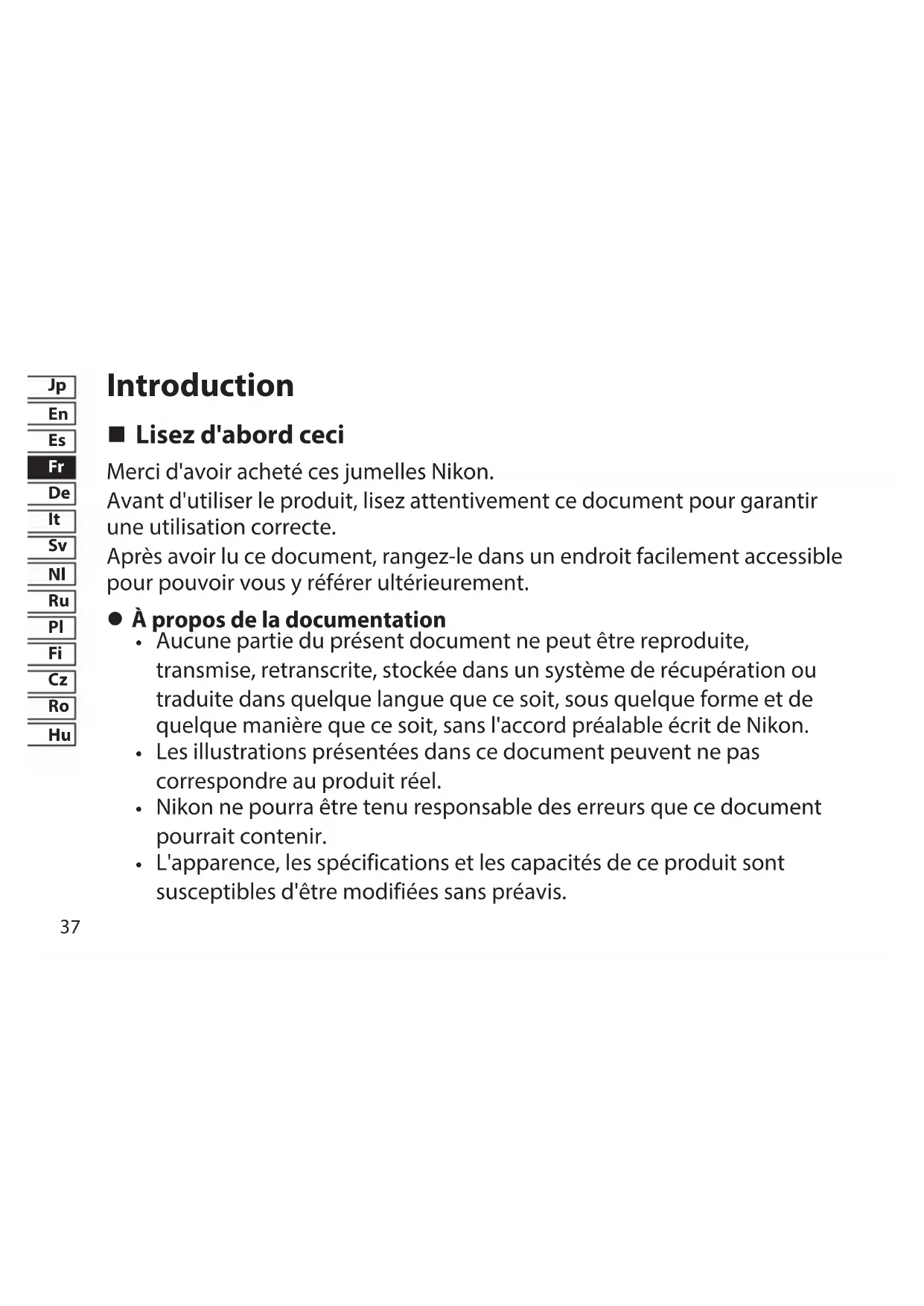 Lisez d'abord ceci Merci d'avoir acheté ces jumelles Nikon. Avant d'utiliser le produit, lisez attentivement ce document pour garantir une utilisation correcte. Après avoir lu ce document, rangez-le dans un endroit facilement accessible pour pouvoir vous y référer ultérieurement.