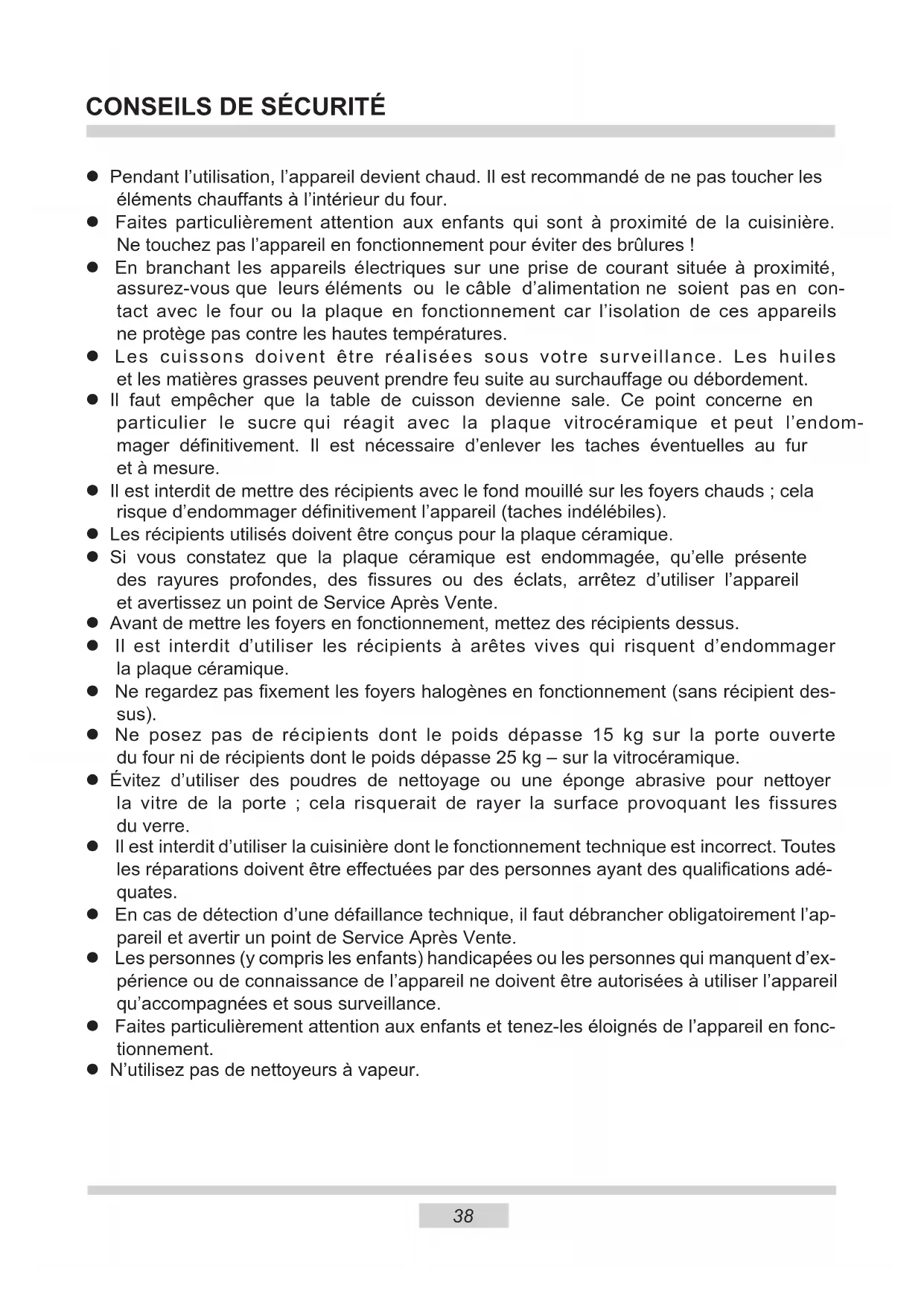 Pendant l’utilisation, l’appareil devient chaud. Il est recommandé de ne pas toucher les éléments chauffants à l’intérieur du four. Faites particulièrement attention aux enfants qui sont à proximité de la cuisinière. Ne touchez pas l’appareil en fonctionnement pour éviter des brûlures ! En branchant les appareils électriques sur une prise de courant située à proximité, assurez-vous que leurs éléments ou le câble d’alimentation ne soient pas en con- tact avec le four ou la plaque en fonctionnement car l’isolation de ces appareils ne protège pas contre les hautes températures. Les cuissons doivent être réalisées sous votre surveillance. Les huiles et les matières grasses peuvent prendre feu suite au surchauffage ou débordement. Il faut empêcher que la table de cuisson devienne sale. Ce point concerne en particulier le sucre qui réagit avec la plaque vitrocéramique et peut l’endom- mager définitivement. Il est nécessaire d’enlever les taches éventuelles au fur et à mesure. Il est interdit de mettre des récipients avec le fond mouillé sur les foyers chauds ; cela risque d’endommager dénitivement l’appareil (taches indélébiles). Les récipients utilisés doivent être conçus pour la plaque céramique. Si vous constatez que la plaque céramique est endommagée, qu’elle présente des rayures profondes, des fissures ou des éclats, arrêtez d’utiliser l’appareil et avertissez un point de Service Après Vente. Avant de mettre les foyers en fonctionnement, mettez des récipients dessus. Il est interdit d’utiliser les récipients à arêtes vives qui risquent d’endommager la plaque céramique. Ne regardez pas xement les foyers halogènes en fonctionnement (sans récipient des- sus). Ne posez pas de récipients dont le poids dépasse 15 kg sur la porte ouverte du four ni de récipients dont le poids dépasse 25 kg – sur la vitrocéramique. Évitez d’utiliser des poudres de nettoyage ou une éponge abrasive pour nettoyer la vitre de la porte ; cela risquerait de rayer la surface provoquant les fissures du verre. Il est interdit d’utiliser la cuisinière dont le fonctionnement technique est incorrect. Toutes les réparations doivent être effectuées par des personnes ayant des qualications adé- quates. En cas de détection d’une défaillance technique, il faut débrancher obligatoirement l’ap- pareil et avertir un point de Service Après Vente. Les personnes (y compris les enfants) handicapées ou les personnes qui manquent d’ex- périence ou de connaissance de l’appareil ne doivent être autorisées à utiliser l’appareil qu’accompagnées et sous surveillance. Faites particulièrement attention aux enfants et tenez-les éloignés de l’appareil en fonc- tionnement. N’utilisez pas de nettoyeurs à vapeur.39 Utilisez la chaleur accumulée du four. Si le temps de préparation dépasse 40 mi- nutes, il faut éteindre le four 10 minutes avant la n de cuisson. Pour les grillades, utilisez une chaleur