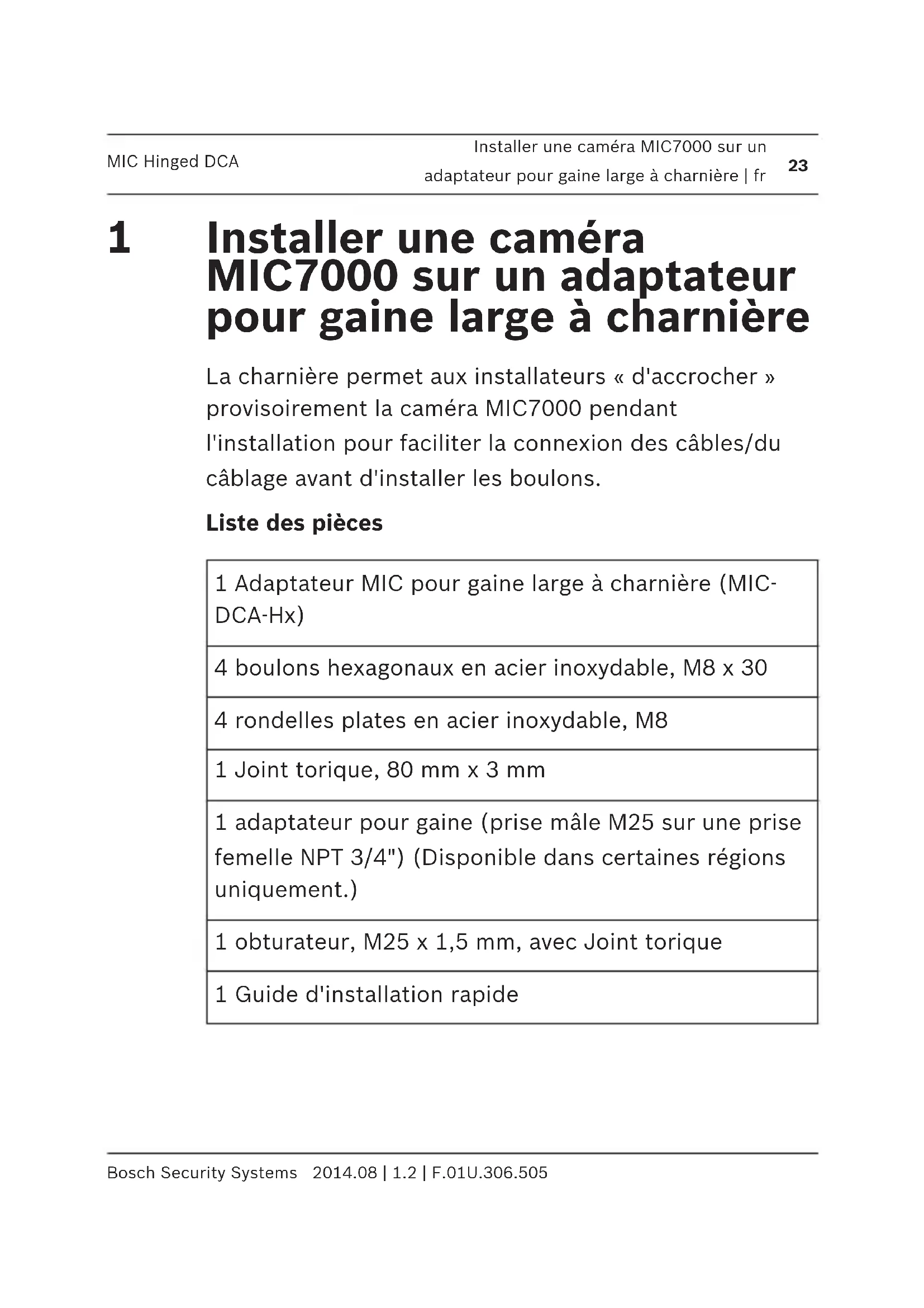 de | So installieren Sie eine MIC7000-Kamera auf einem schwenkbaren DCA-Adapter MIC Hinged DCA 2014.08 | 1.2 | F.01U.306.505 Bosch Security SystemsInstaller une caméra MIC7000 sur un adaptateur pour gaine large à charnière La charnière permet aux installateurs « d'accrocher » provisoirement la caméra MIC7000 pendant l'installation pour faciliter la connexion des câbles/du câblage avant d'installer les boulons. Liste des pièces 1 Adaptateur MIC pour gaine large à charnière (MIC- DCA-Hx) 4 boulons hexagonaux en acier inoxydable, M8 x 30 4 rondelles plates en acier inoxydable, M8 1 Joint torique, 80 mm x 3 mm 1 adaptateur pour gaine (prise mâle M25 sur une prise femelle NPT 3/4") (Disponible dans certaines régions uniquement.) 1 obturateur, M25 x 1,5 mm, avec Joint torique 1 Guide d'installation rapide