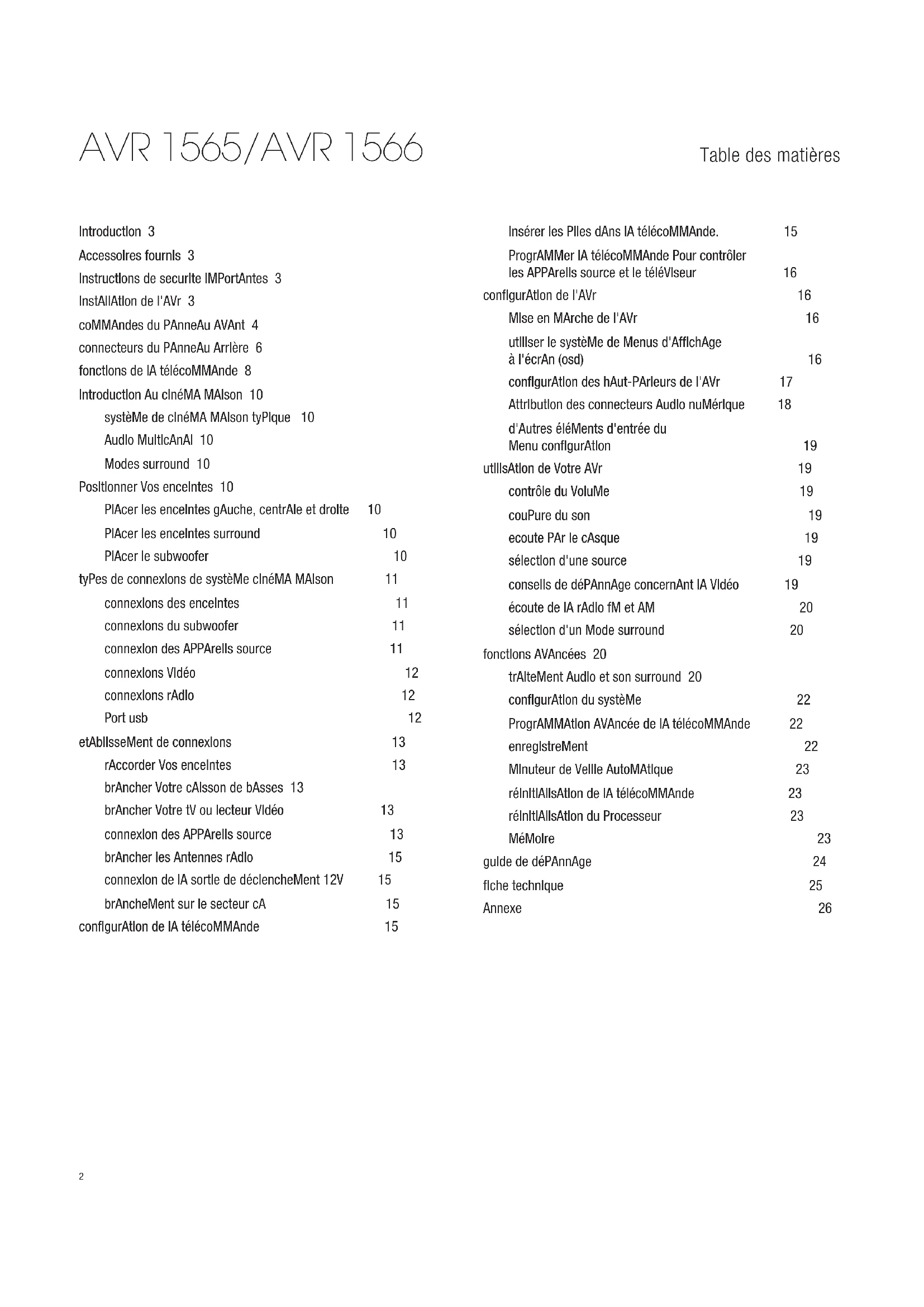 ou lecteur DVD ne dispose pas de connecteur HDMI mais d'un un connecteur vidéo composante, l'utilisation du connecteur vidéo composante offre des performances vidéo de qualité supérieure. Vous aurez aussi besoin d'établir une connexion audio du lecteur vers l'AVR. Connecteurs d'entrée audio numérique : Si vos appareils source non HDMI disposent de sorties numériques, connectez-les aux connecteurs audio numérique de l'AVR. REMARQUE : Ne faites qu'un seul type de connexion numérique (HDMI, optique ou coaxiale) de chaque appareil. Pour plus d'informations, reportez-vous à " Connexion de vos appareils Source " à la page 13. Connecteur de sortie Vidéo 2 : Raccordez le connecteur d'entrée d'un enregistreur vidéo analogique vidéo au Connecteur de sortie Vidéo 2 de l'AVR. Vous pouvez enregistrer n'importe quel signal d'entrée vidéo composite. Remarque : pour enregistrer l'audio et la vidéo de l'appareil source, raccordez le Connecteur de sortie Vidéo 2 de l'AVR aux entrées audio de l'enregistreur vidéo analogique. Connecteurs d'entrée Vidéo composite : Utilisez les connecteurs vidéo composite pour les appareils source vidéo qui ne disposant pas de connecteurs HDMI ou vidéo composante. Vous aurez aussi besoin d'établir une connexion audio de l'appareil source vers l'AVR. Pour plus d'informations, reportez-vous à " Connexion de vos appareils Source " à la page 13. Connecteur Subwoofer : Raccordez ce connecteur à un subwoofer actif avec une entrée de niveau ligne. Pour plus d'informations, reportez-vous à "Connexion du Subwoofer" à la page 13. Connecteurs d'entrée/sortie audio analogique : Utilisez les connecteurs d'entrée/ sortie audio analogique de l'AVR pour les appareils source qui ne disposent pas de connecteurs HDMI ou audio numérique. Utilisez les connecteurs de sortie vidéo 2 et sortie cassette (Tape Out) pour connecter les entrées audio d'un magnétoscope et d'un lecteur de cassettes. Pour plus d'informations, reportez-vous à " Connexion de vos appareils Source " à la page 13. Connecteurs d'enceintes : Utilisez des câbles d'enceinte à deux conducteurs pour connecter chaque ensemble de bornes à l'enceinte appropriée. Pour plus d'informations, reportez-vous à " Connexion des enceintes " à la page 13. Interrupteur d’alimentation principal : Cet interrupteur mécanique met l'AVR sous ou hors tension. Il est habituellement laissé sur marche (sous tension) ; il ne peut être actionné à l'aide de la télécommande. Connecteur de déclenchement 12V : Ce connecteur fournit 12V CC à chaque fois que l'AVR est allumé. Il peut être utilisé pour allumer et éteindre d'autres appareils tels qu'un subwoofer amplifié. Connecteur d'entrée CA : Après avoir fait toutes les autres connexions, branchez le cordon d'alimentation secteur fourni dans cette prise et dans une prise murale non commutée. 0293CSK - HK (x65Series) AVR1565_1566 OM [HKP1990], WORK03.indd 7 30/06/11 9:41:538 AVR 1565/AVR 1566 Fonctions de la télécommande Fonctions de la télécommande Lentille de l'émetteur IR Touche couper le son Touches Sélecteur de source Touches Volume Haut/Bas Touche Configuration des enceintes Touche OK Touche Retard Touches numériques Touche Mémoire Touches Macro Touches de déplacement Touche Variateur d'éclairage Touche Saut de Disque Touches Station préréglée Haut/Bas Touche Effacer Touches Gauche/Droite/Haut/Bas Témoin Programme Touche AVR Touches Veille auto/Chaîne suivante/précédente Touche OSD Touche contrôle niveau de canal Touche Entrée numérique Touche mode de syntonisation Touche Accès direct à une Station Touches Syntonisation Haut/Bas Touche Contrôle de tonalité Touche Mode Nuit Touches Saut de piste avant/arrière Touche Tonalité de test Touche Eteindre Touche Allumer 0293CSK - HK (x65Series) AVR1565_1566 OM [HKP1990], WORK03.indd 8 30/06/11 9:41:539 AVR 1565/AVR 1566 FRANÇ AIS Fonctions de la télécommande, suite Fonctions de la télécommande, suite En plus de contrôler l'AVR, la télécommande de l'AVR permet de contrôler jusqu'à 8 autres équipements. Pendant le processus d'installation, vous pouvez programmer les codes de chacun de vos composants source dans la télécommande. (Pour les informations de programmation, reportez-vous à " Programmer la télécommande pour contrôler vos appareils source et téléviseur " à la page 16). Pour faire fonctionner un appareil, appuyez sur sa touche sélecteur de source pour changer le mode de contrôle de la télécommande. La fonction d'une touche dépend du composant contrôlé. Reportez-vous au tableau A10 de l'annexe pour la liste des fonctions de chaque type de composant. La plupart des touches de la télécommande ont des fonctions dédiées, même si les codes précis transmis varient selon l'appareil spécifique contrôlé. À cause de la grande variété de fonctions des divers appareils source, nous n'avons inclus que quelques unes des fonctions les plus souvent utilisées de la télécommande : touches alphanumériques, de déplacement, de contrôle des chaînes télé, d'accès aux menus et marche/arrêt. Pour passer à tout moment la télécommande en mode contrôle de l'AVR, appuyez sur la touche AVR. Lentille de l'émetteur IR : Au fur et à mesure que les touches de la télécommande sont appuyées, les codes infrarouges sont émis à travers cette Lentille. Témoin Programme : Ce témoin s'allume pour indiquer différentes procédures lorsque la télécommande est en mode programmation. Touches Marche/Arrêt : Appuyez sur ces touches pour allumer ou éteindre l'AVR ou l'appareil contrôlé. L'interrupteur d'alimentation principal du panneau arrière de l'AVR doit être sur marche pour que cette touche puisse allumer ou éteindre l'AVR. Touche couper le son : Appuyez sur cette touche pour couper le son de la sortie des connecteurs des enceintes et casque de l'AVR. Pour rétablir le son, appuyez sur cette touche ou réglez le volume. Touche AVR : Appuyez