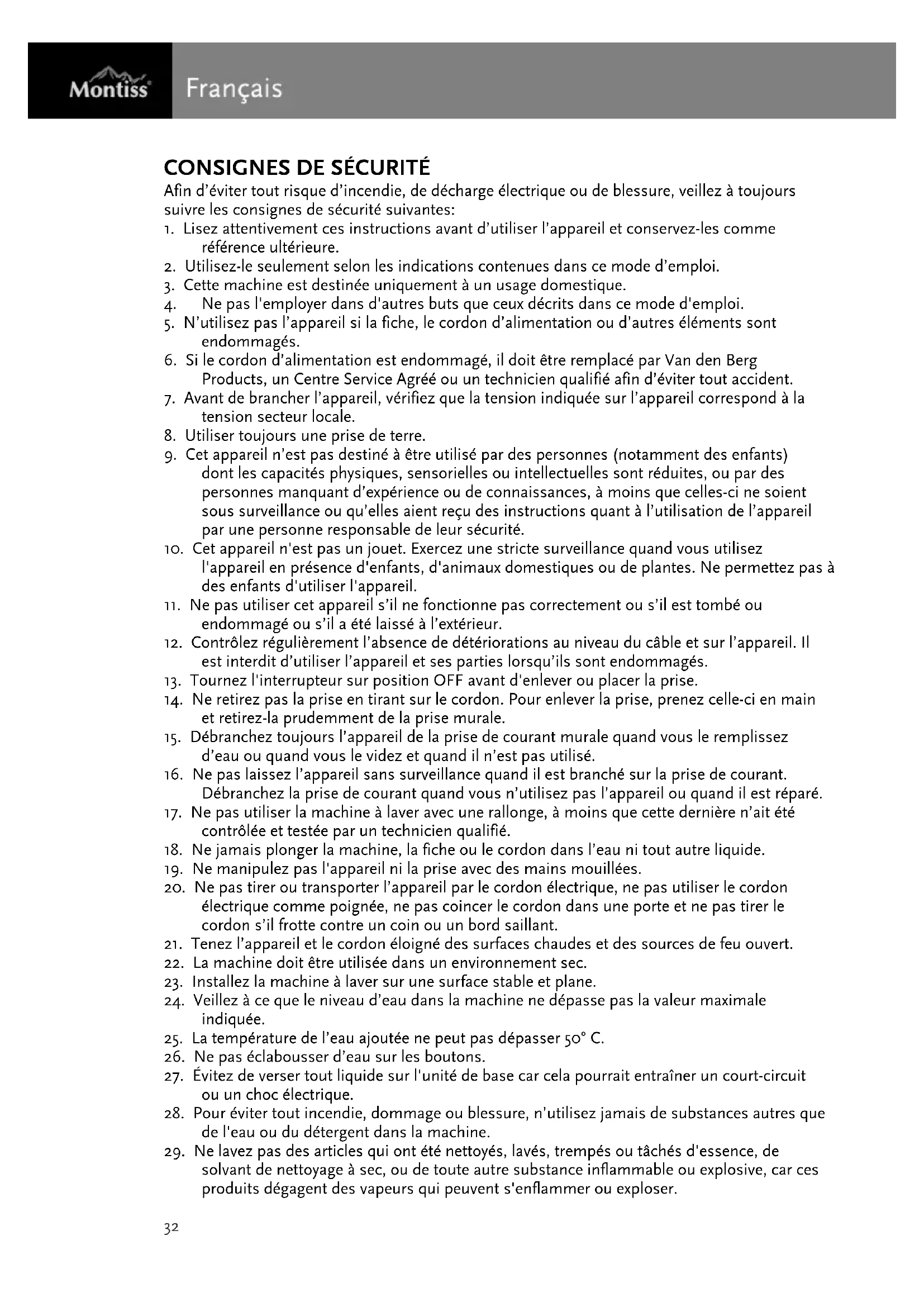 FICHE TECHNIQUE Numéro du modèle HWM5757M Puissance 85W Tension nominale 230V~ Fréquence nominale 50Hz Montiss est une marque déposée de : Van den Berg Products BV IJzerwerf 10-12 6641 TK Beuningen Pays-Bas www.vdbergproducts.com