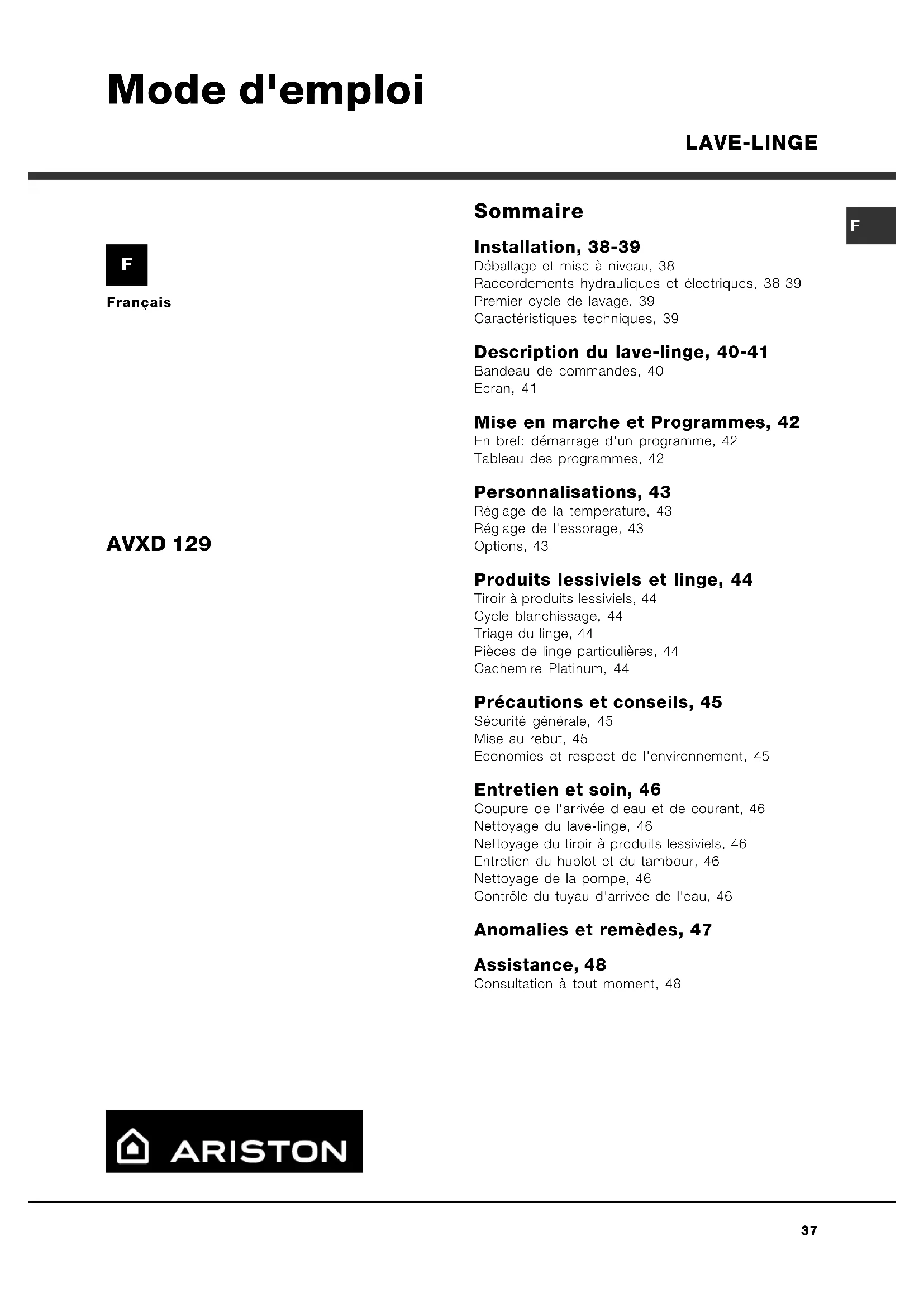 Français Sommaire Installation, 38-39 Déballage et mise à niveau, 38 Raccordements hydrauliques et électriques, 38-39 Premier cycle de lavage, 39 Caractéristiques techniques, 39 Description du lave-linge, 40-41 Bandeau de commandes, 40 Ecran, 41 Mise en marche et Programmes, 42 En bref: démarrage d'un programme, 42 Tableau des programmes, 42 Personnalisations, 43 Réglage de la température, 43 Réglage de l'essorage, 43 Options, 43 Produits lessiviels et linge, 44 Tiroir à produits lessiviels, 44 Cycle blanchissage, 44 Triage du linge, 44 Pièces de linge particulières, 44 Cachemire Platinum, 44 Précautions et conseils, 45 Sécurité générale, 45 Mise au rebut, 45 Economies et respect de l'environnement, 45 Entretien et soin, 46 Coupure de l'arrivée d'eau et de courant, 46 Nettoyage du lave-linge, 46 Nettoyage du tiroir à produits lessiviels, 46 Entretien du hublot et du tambour, 46 Nettoyage de la pompe, 46 Contrôle du tuyau d'arrivée de l'eau, 46 Anomalies et remèdes, 47 Assistance, 48 Consultation à tout moment, 48 LAVE-LINGE AVXD 129 Mode d'emploi F38