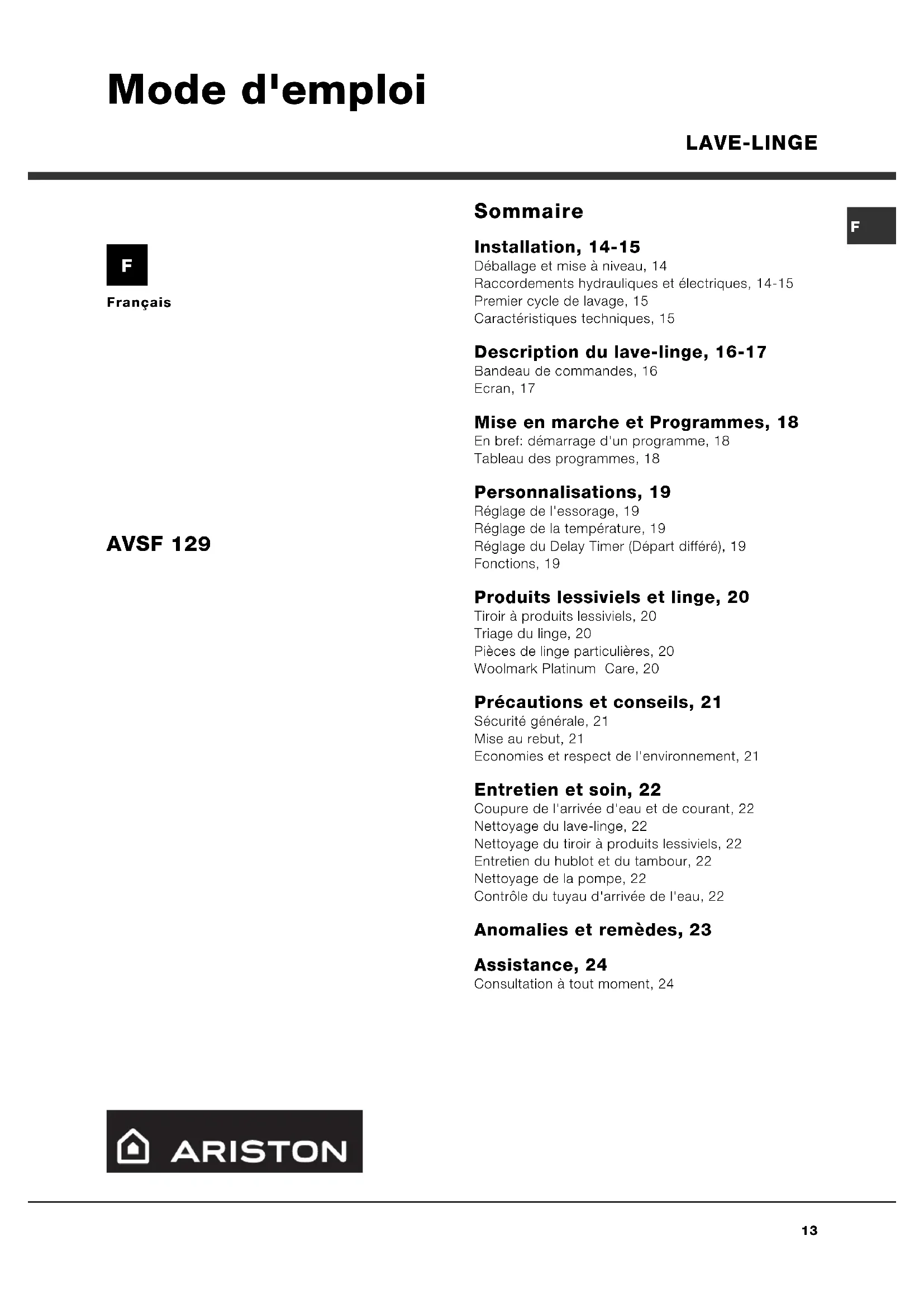Français Sommaire Installation, 14-15 Déballage et mise à niveau, 14 Raccordements hydrauliques et électriques, 14-15 Premier cycle de lavage, 15 Caractéristiques techniques, 15 Description du lave-linge, 16-17 Bandeau de commandes, 16 Ecran, 17 Mise en marche et Programmes, 18 En bref: démarrage d'un programme, 18 Tableau des programmes, 18 Personnalisations, 19 Réglage de l'essorage, 19 Réglage de la température, 19 Réglage du Delay Timer (Départ différé), 19 Fonctions, 19 Produits lessiviels et linge, 20 Tiroir à produits lessiviels, 20 Triage du linge, 20 Pièces de linge particulières, 20 Woolmark Platinum Care, 20 Précautions et conseils, 21 Sécurité générale, 21 Mise au rebut, 21 Economies et respect de l'environnement, 21 Entretien et soin, 22 Coupure de l'arrivée d'eau et de courant, 22 Nettoyage du lave-linge, 22 Nettoyage du tiroir à produits lessiviels, 22 Entretien du hublot et du tambour, 22 Nettoyage de la pompe, 22 Contrôle du tuyau d'arrivée de l'eau, 22 Anomalies et remèdes, 23 Assistance, 24 Consultation à tout moment, 24 LAVE-LINGE AVSF 129 Mode d'emploi F14