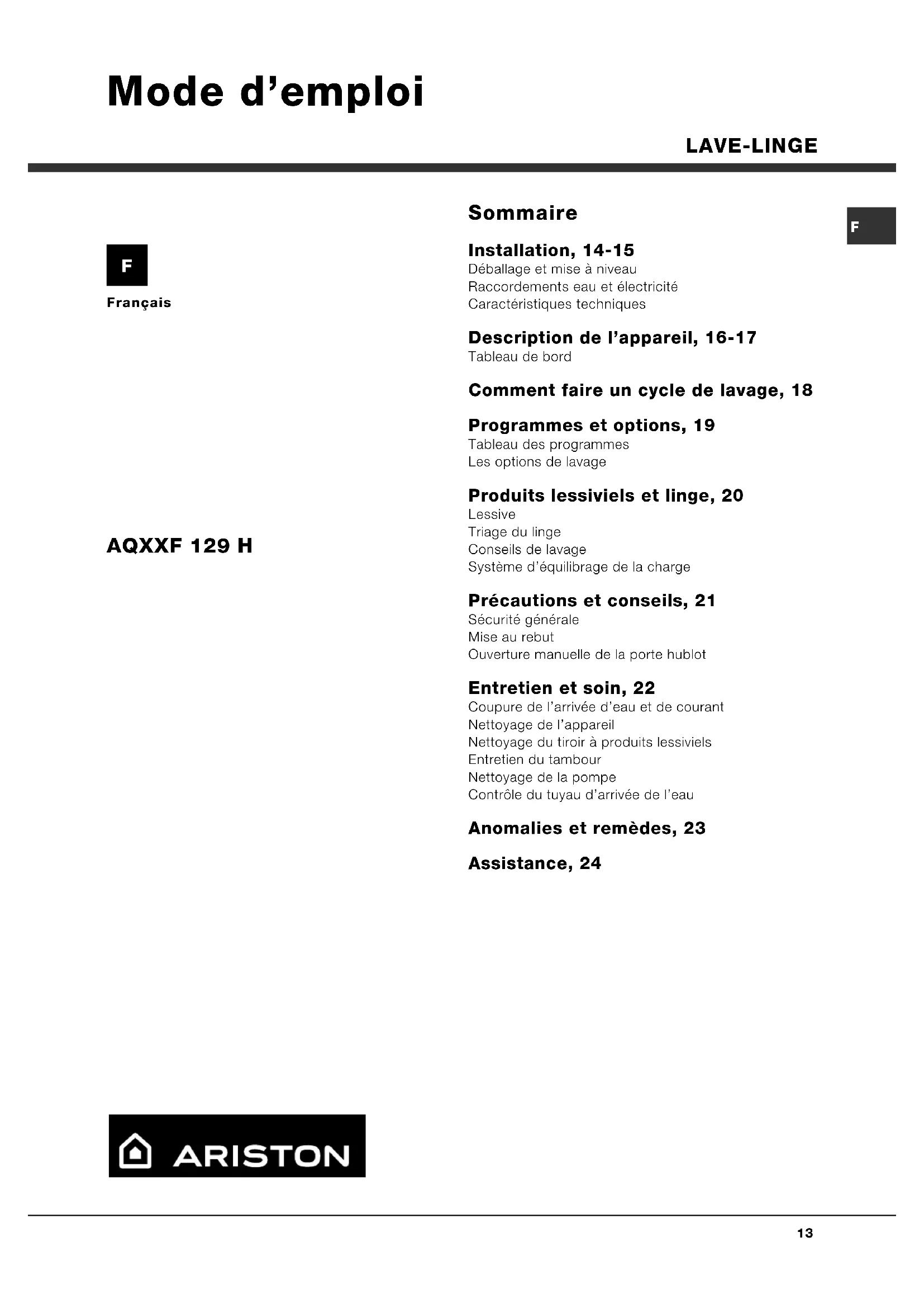Français Sommaire Installation, 14-15 Déballage et mise à niveau Raccordements eau et électricité Caractéristiques techniques Description de lappareil, 16-17 Tableau de bord Comment faire un cycle de lavage, 18 Programmes et options, 19 Tableau des programmes Les options de lavage Produits lessiviels et linge, 20 Lessive Triage du linge Conseils de lavage Système déquilibrage de la charge Précautions et conseils, 21 Sécurité générale Mise au rebut Ouverture manuelle de la porte hublot Entretien et soin, 22 Coupure de larrivée deau et de courant Nettoyage de lappareil Nettoyage du tiroir à produits lessiviels Entretien du tambour Nettoyage de la pompe Contrôle du tuyau darrivée de leau Anomalies et remèdes, 23 Assistance, 24