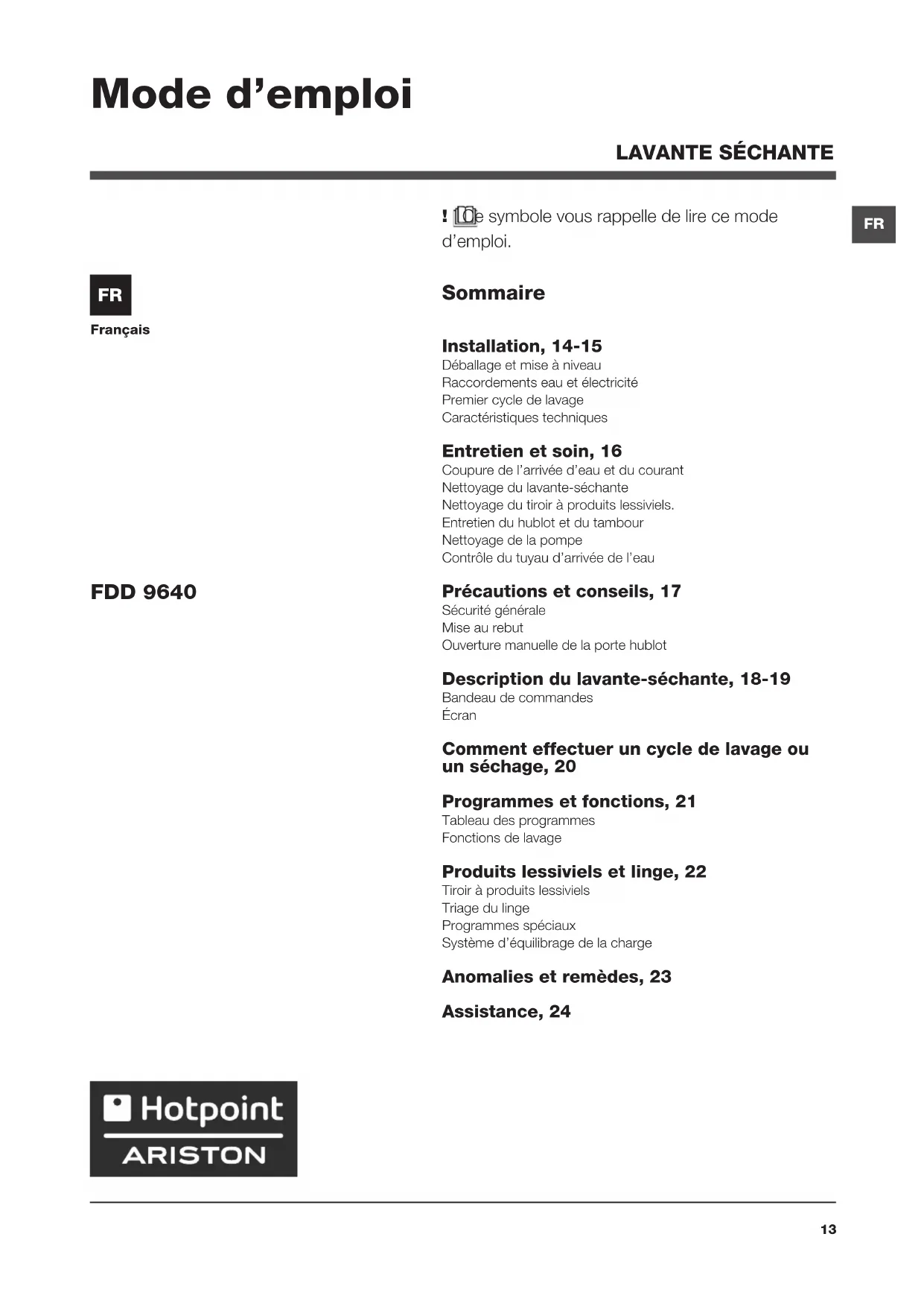 Retrouvez gratuitement la notice de l'appareil FDD 9640 Ariston Thermo au format PDF.