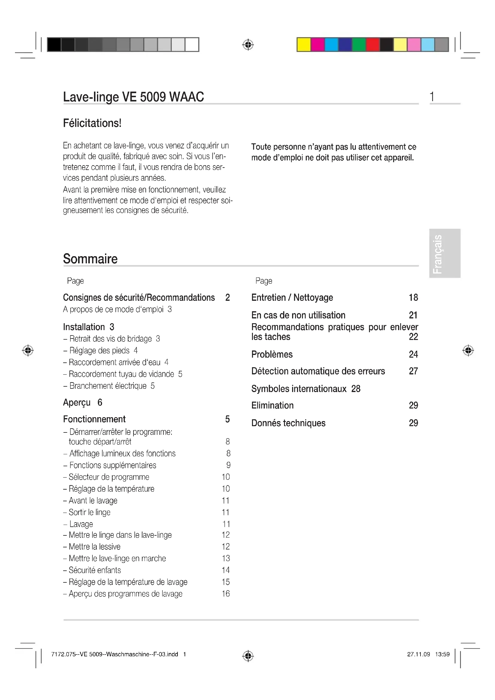 A propos de ce mode d‘emploi 3 Installation 3 − Retrait des vis de bridage 3 − Réglage des pieds 4 – Raccordement arrivée d‘eau 4 – Raccordement tuyau de vidande 5 − Branchement électrique 5 Aperçu 6 Fonctionnement 5 − Démarrer/arrêter le programme: touche départ/arrêt 8 − Affichage lumineux des fonctions 8 − Fonctions supplémentaires 9 – Sélecteur de programme 10 – Réglage de la température 10 – Avant le lavage 11 – Sortir le linge 11 − Lavage 11 – Mettre le linge dans le lave-linge 12 – Mettre la lessive 12 – Mettre le lave-linge en marche 13 – Sécurité enfants 14 – Réglage de la température de lavage 15 – Aperçu des programmes de lavage 16 Page Entretien / Nettoyage 18 En cas de non utilisation 21 Recommandations pratiques pour enlever les taches 22 Problèmes 24 Détection automatique des erreurs 27 Symboles internationaux 28 Elimination 29 Donnés techniques 29 7172.075--VE 5009--Waschmaschine--F-03.indd 1 27.11.09 13:592 Français Consignes de sécurité/ Recommandations Avant de brancher le lave-linge, prenez le temps de lire attentivement et entièrement ces recom- mandations, car celles-ci contiennent des infor- mations importantes sur la sécurité et l‘utilisation de cet appareil. Consignes de sécurité