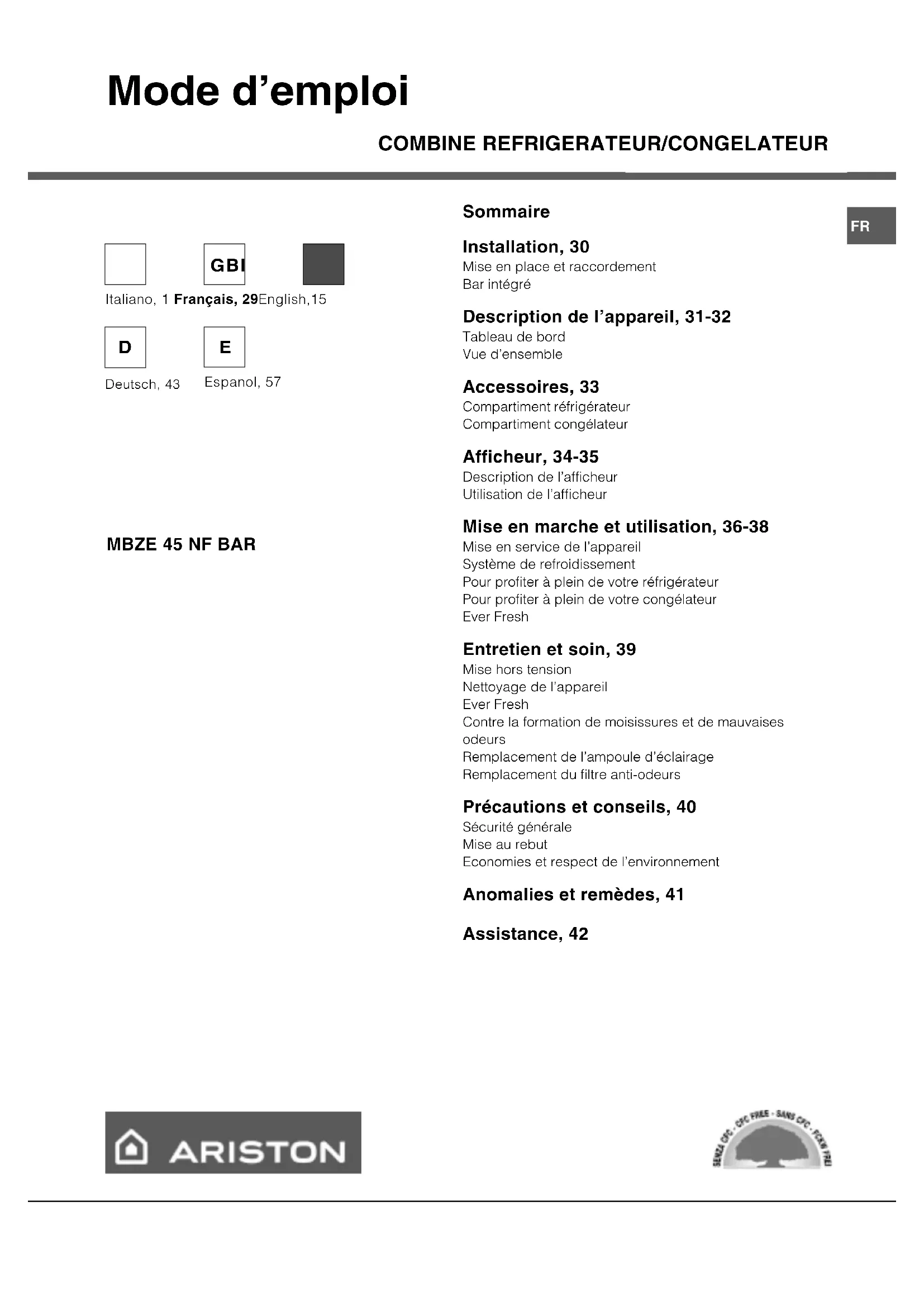 Retrouvez gratuitement la notice de l'appareil MBZE45NFBAR Ariston Thermo au format PDF.