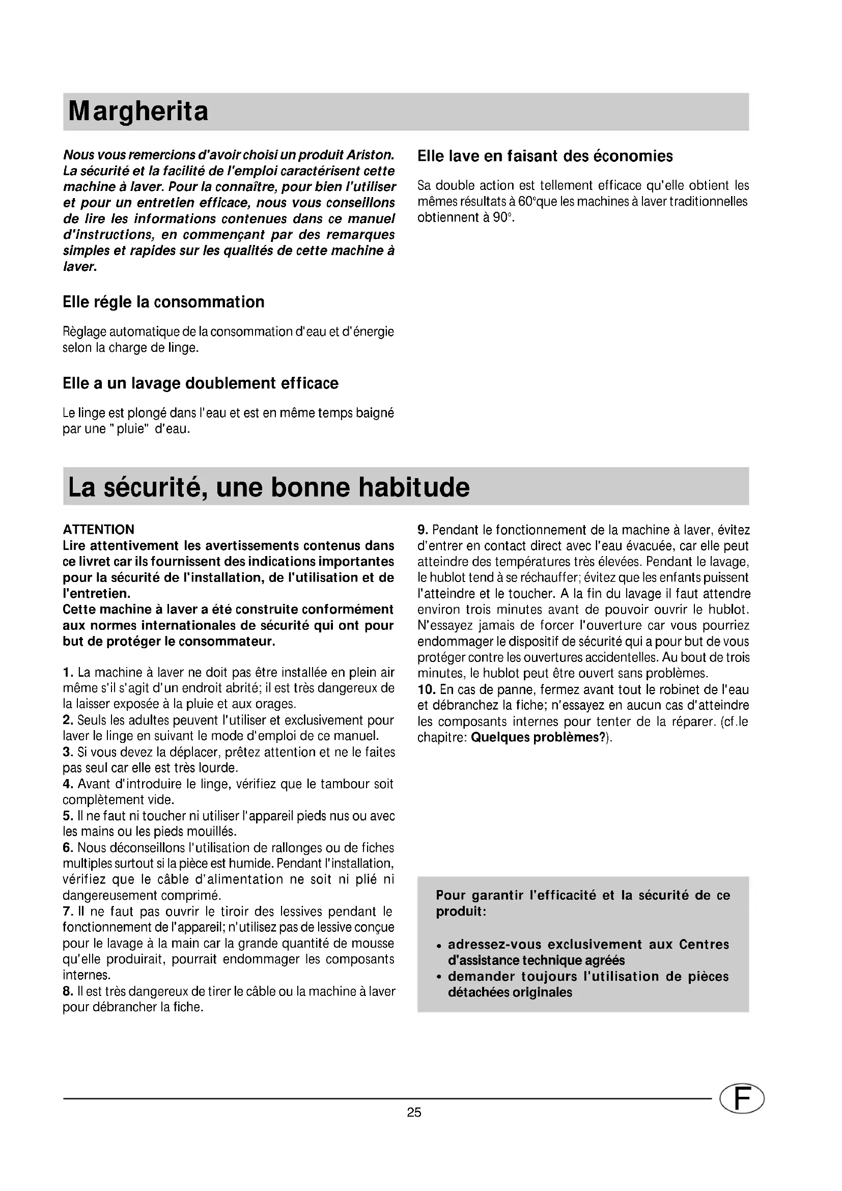 Nous vous remercions d'avoir choisi un produit Ariston. La sécurité et la facilité de l'emploi caractérisent cette machine à laver. Pour la connaître, pour bien l'utiliser et pour un entretien efficace, nous vous conseillons de lire les informations contenues dans ce manuel d'instructions, en commençant par des remarques simples et rapides sur les qualités de cette machine à laver. Elle régle la consommation Règlage automatique de la consommation d'eau et d'énergie selon la charge de linge. Elle a un lavage doublement efficace Le linge est plongé dans l'eau et est en même temps baigné par une "pluie" d'eau. La sécurité, une bonne habitude ATTENTION Lire attentivement les avertissements contenus dans ce livret car ils fournissent des indications importantes pour la sécurité de l'installation, de l'utilisation et de l'entretien. Cette machine à laver a été construite conformément aux normes internationales de sécurité qui ont pour but de protéger le consommateur.
