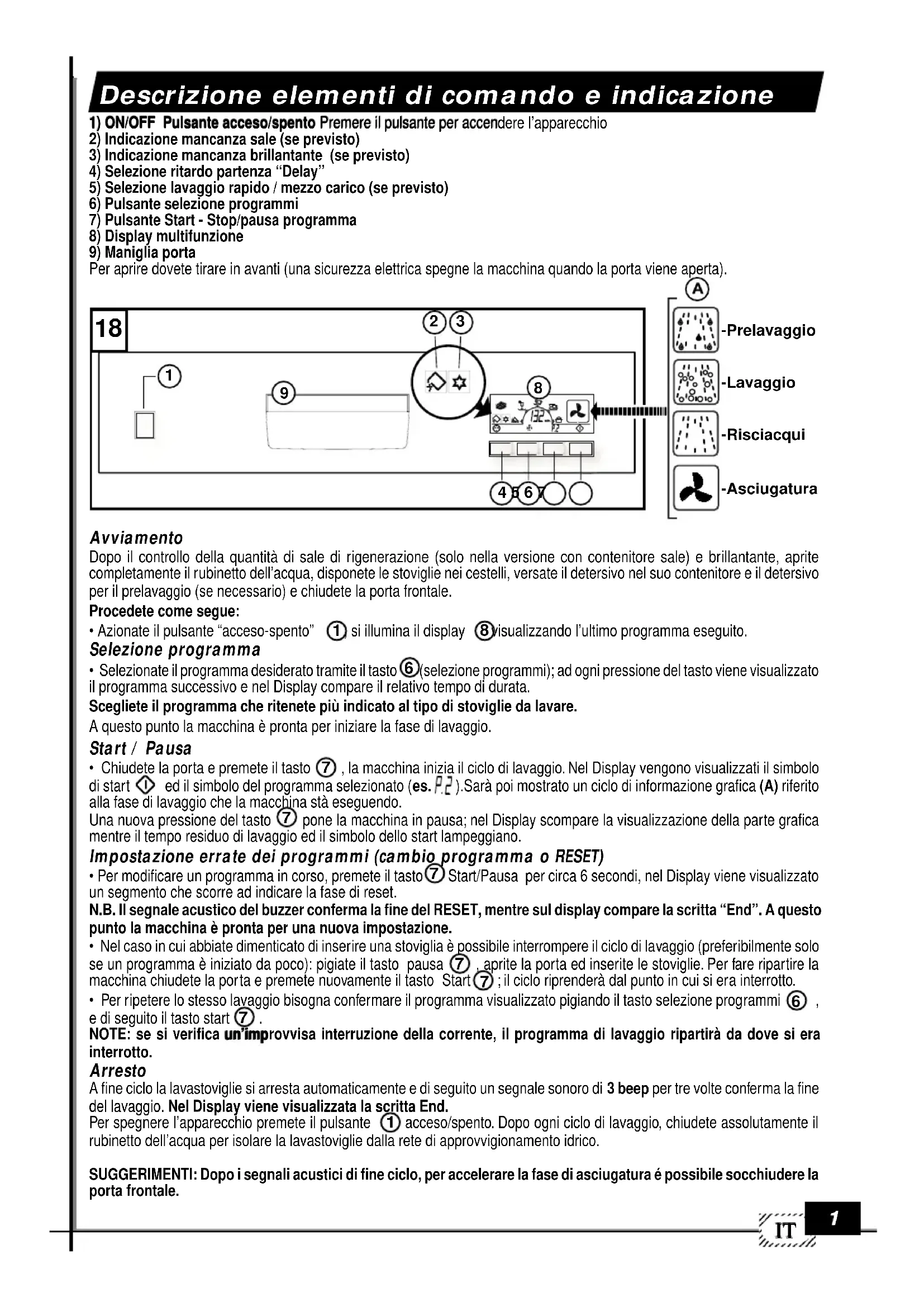 - Pour répéter le même lavage il faut confirmer le programme affiché en appuyant sur la touche de sélection des programmes , et fermez la porte.REMARQUES : en cas de panne de courant, le programme de lavage va redémarrer de l’endroit où il a été inter-rompu. Arrêt A la fin du cycle, le lave-vaisselle s’arrête automatiquement et un signal sonore de 3 bips répété trois fois confirme la fin du lavage. Le message “ End ” est affiché à l’écran ; quand la porte s’ouvre, l’afficheur s’allume et le message est affiché pendant 10 secondes environ, après quoi ce n’est que le numéro du dernier programme qui reste affiché. Pour l’éteindre, appuyez sur la touche Allumé/Eteint. Après chaque cycle de lavage, n’oubliez absolument pas de fermer le robinet de l’eau pour isoler le lave-vaisselle de l’alimentation en eau.CONSEILS : Après les signaux acoustiques indiquant la fin du cycle, pour accélérer le séchage vous pouvez laisserla porte frontale entrouverte. 18a