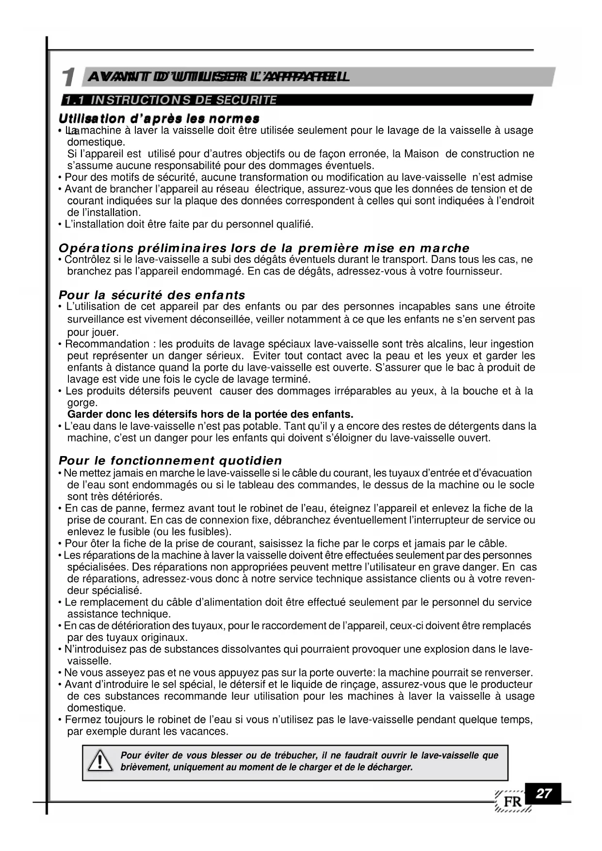 - La machine à laver la vaisselle doit être utilisée seulement pour le lavage de la vaisselle à usagedomestique.Si l’appareil est utilisé pour d’autres objectifs ou de façon erronée, la Maison de construction nes’assume aucune responsabilité pour des dommages éventuels.• Pour des motifs de sécurité, aucune transformation ou modification au lave-vaisselle n’est admise• Avant de brancher l’appareil au réseau électrique, assurez-vous que les données de tension et decourant indiquées sur la plaque des données correspondent à celles qui sont indiquées à l’endroitde l’installation.• L’installation doit être faite par du personnel qualifié. Opérations préliminaires lors de la première mise en marche