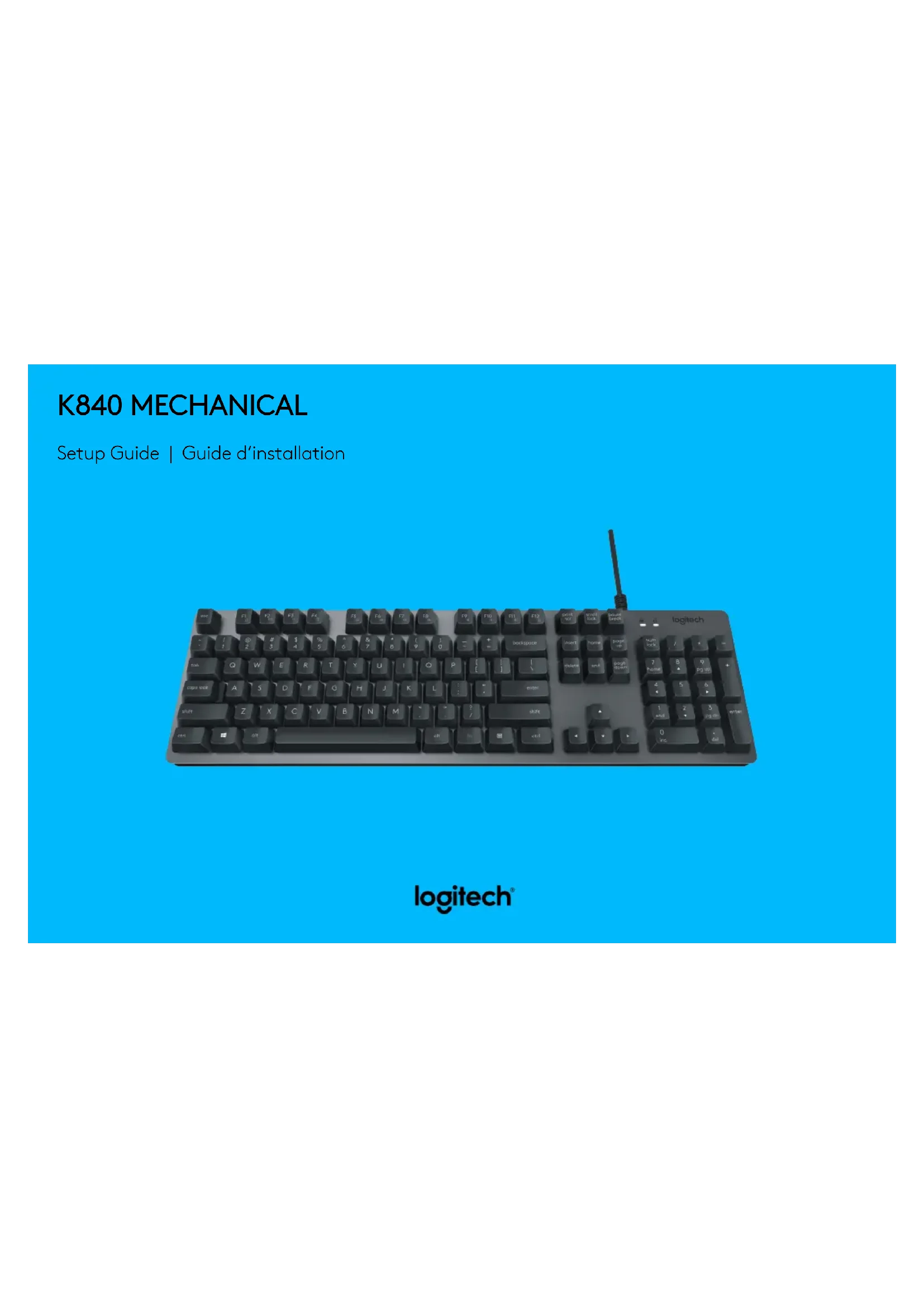FILAIRE LOGITECHK840 1 Des fonctions de productivité avancées 2 Câble USB 3 Indicateur de verrouillage des majuscules 4 Indicateur de verrouillage des touches Windows 5 Système de rangement des câbles pour casques 6 Pieds inclinables à 8° 7 Patins en caoutchouc INSTALLER 1 Mettez votre ordinateur sous tension. 2 Connectez le clavier mécanique laire K840 à un port USB de votre ordinateur et commencez à taper. 3 Téléchargez Logitech