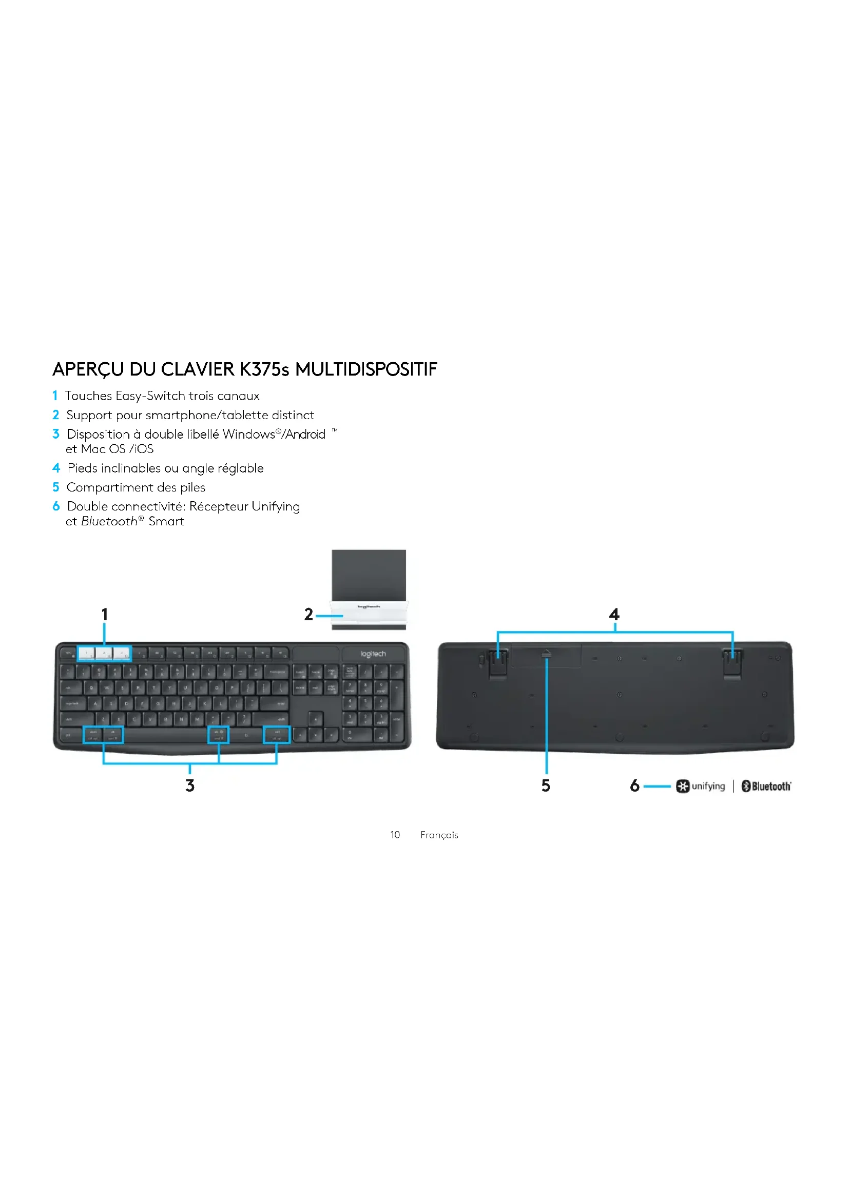 5 611 Français SOYEZ CONNECTÉ Le clavier et support sans l K375s multidispositif vous permet de connecter jusqu'à trois dispositifs via Bluetoo th Smart ou via le récepteur USB Unifying déjà couplé. Conguration rapide Suivez les étapes ci-dessous pour le connecter facilement à votre ordinateur, ordinateur portable ou tablette. Pour plus d'informations sur la connexion grâce à Unifying ou Blu etooth Smart, consultez les sections ci-dessous. Mac