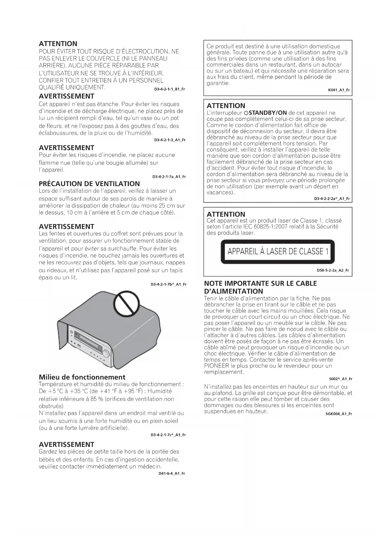 D’ALIMENTATION Tenir le câble d’alimentation par la fiche. Ne pas débrancher la prise en tirant sur le câble et ne pas toucher le câble avec les mains mouillées. Cela risque de provoquer un court-circuit ou un choc électrique. Ne pas poser l’appareil ou un meuble sur le câble. Ne pas pincer le câble. Ne pas faire de noeud avec le câble ou l’attacher à d’autres câbles. Les câbles d’alimentation doivent être posés de façon à ne pas être écrasés. Un câble abîmé peut provoquer un risque d’incendie ou un choc électrique. Vérifier le câble d’alimentation de temps en temps. Contacter le service après-vente PIONEER le plus proche ou le revendeur pour un remplacement. S002*_A1_Fr Ce produit est destiné à une utilisation domestique générale. Toute panne due à une utilisation autre qu'à des fins privées (comme une utilisation à des fins commerciales dans un restaurant, dans un autocar ou sur un bateau) et qui nécessite une réparation sera aux frais du client, même pendant la période de garantie. K041_A1_Fr ATTENTION Cet appareil est un produit laser de Classe 1, classé selon l’article IEC 60825-1:2007 relatif à la Sécurité des produits laser.