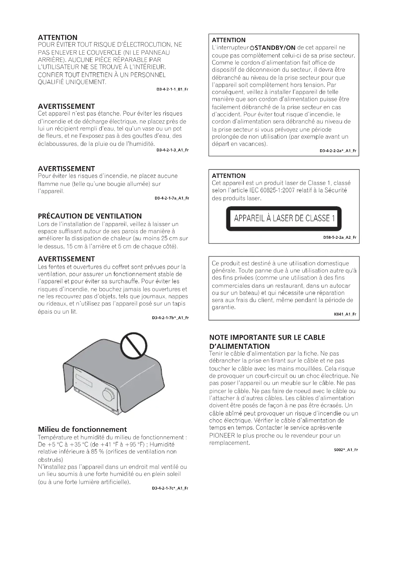 D’ALIMENTATION Tenir le câble d’alimentation par la fiche. Ne pas débrancher la prise en tirant sur le câble et ne pas toucher le câble avec les mains mouillées. Cela risque de provoquer un court-circuit ou un choc électrique. Ne pas poser l’appareil ou un meuble sur le câble. Ne pas pincer le câble. Ne pas faire de noeud avec le câble ou l’attacher à d’autres câbles. Les câbles d’alimentation doivent être posés de façon à ne pas être écrasés. Un câble abîmé peut provoquer un risque d’incendie ou un choc électrique. Vérifier le câble d’alimentation de temps en temps. Contacter le service après-vente PIONEER le plus proche ou le revendeur pour un remplacement.S002*_A1_FrATTENTIONL’interrupteur STANDBY/ON de cet appareil ne coupe pas complètement celui-ci de sa prise secteur. Comme le cordon d’alimentation fait office de dispositif de déconnexion du secteur, il devra être débranché au niveau de la prise secteur pour que l’appareil soit complètement hors tension. Par conséquent, veillez à installer l’appareil de telle manière que son cordon d’alimentation puisse être facilement débranché de la prise secteur en cas d’accident. Pour éviter tout risque d’incendie, le cordon d’alimentation sera débranché au niveau de la prise secteur si vous prévoyez une période prolongée de non utilisation (par exemple avant un départ en vacances).D3-4-2-2-2a*_A1_Fr ;&0B6<;(B)UERRN࣮࣌ࢪ㸰㸮㸯㸲ᖺ㸰᭶㸳᪥ࠉỈ᭙᪥ࠉ༗ᚋ㸱㸰㸯ศK058a_A1_Fr
