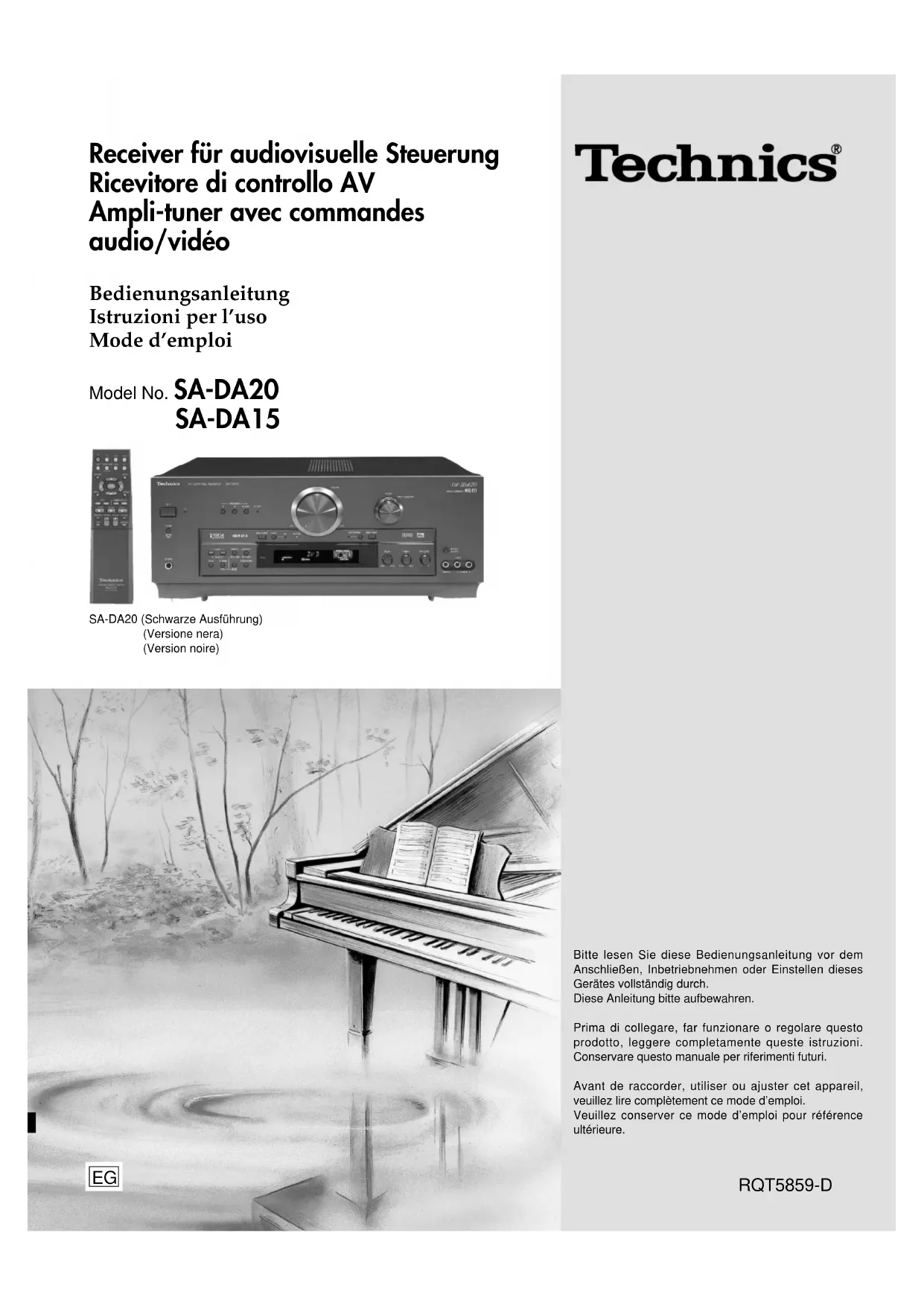 UMWELTSCHUTZBESTIMMUNGEN.5 RQT5859 Informazioni per la sicurezza Sistemazione Disporre l’unità su una superficie piana non soggetta alla luce diretta del sole, a temperature elevate, all’eccessiva umidità e a forti vibrazioni. Queste condizioni potrebbero danneggiare l’involucro esterno e gli altri componenti e di conseguenza accorciare la durata dell’unità. Non appoggiare oggetti pesanti sull’unità. Tensione Non utilizzare sorgenti di alimentazione ad alta tensione. Questo potrebbe sovraccaricare l’unità e causare un incendio. Non utilizzare sorgenti di alimentazione in corrente continua. Controllare attentamente la sorgente prima di installare l’unità su un’imbarcazione o in altri posti dove viene impiegata la corrente continua. Precauzioni per il cavo di alimentazione Assicurarsi che il cavo di alimentazione sia collegato correttamente e non danneggiato. Un collegamento non corretto e un cavo danneggiato potrebbero causare un incendio o scosse elettriche. Non tirare, piegare o appoggiare oggetti pesanti sul cavo di alimentazione. Per staccare il cavo, afferrare la spina saldamente. Tirando il cavo si corre il rischio di scosse elettriche. Non maneggiare la spina con le mani bagnate. Potrebbe essere causa di scossa elettrica. Corpi estranei Non far penetrare oggetti metallici all’interno dell’unità. Potrebbero causare scosse elettriche o malfunzionamenti. Non lasciar penetrare liquidi all’interno dell’unità. Potrebbero causare scosse elettriche o malfunzionamenti. Se si verifica questa circostanza, staccare immediatamente il cavo di alimentazione dalla presa di corrente e rivolgersi al rivenditore. Non spruzzare insetticidi sopra o all’interno dell’unità. Contengono gas infiammabili che potrebbero incendiarsi se spruzzati nell’unità. Riparazioni Non tentare di riparare questa unità da soli. Se il suono si interrompe, gli indicatori non si accendono, viene emesso fumo o si verificano altri problemi non previsti in questo manuale di istruzioni, rivolgersi al rivenditore o a un centro assistenza autorizzato. Se l’unità viene riparata, smontata o riassemblata da persone non qualificate, potrebbe danneggiarsi e si correrebbe il rischio di scosse elettriche. Per aumentarne la durata quando l’unità non viene utilizzata per un lungo periodo di tempo, staccare il cavo di alimentazione dalla presa di corrente. Précautions de sécurité Placement Placer l’appareil sur une surface plane éloignée de la lumière directe du soleil, de hautes températures, de haute humidité et de vibrations excessives. Ces conditions peuvent endommager le coffret et les autres composants, raccourcissant la durée de vie de l’appareil. Ne pas placer d’objets lourds sur l’appareil. Tension Ne pas utiliser de sources d’alimentation à haute tension. Cela peut surcharger l’appareil et provoquer un incendie. Ne pas utiliser de source d’alimentation à courant continu. Vérifier soigneusement la source lors de l’installation de cet appareil sur un navire ou tout endroit où le courant continu est utilisé. Protection du cordon d’alimentation S’assurer que le cordon est correctement branché et qu’il n’est pas endommagé. Un mauvais raccordement et un cordon endommagé peuvent provoquer un incendie et des décharges électriques. Ne pas tirer, plier ou placer des objets lourds sur le cordon. Saisir fermement la fiche pour débrancher le cordon. Tirer le cordon peut provoquer des décharges électriques. Ne pas manipuler la fiche avec les mains mouillées. Cela peut provoquer des décharges électriques. Corps étranger Ne pas laisser d’objets métalliques tomber dans l’appareil. Cela peut provoquer des décharges électriques ou un mauvais fonctionnement. Ne pas laisser de liquides pénétrer dans l’appareil. Cela peut provoquer des décharges électriques ou un mauvais fonctionnement. Si cela se produit, débrancher immédiatement l’alimentation et contacter le revendeur. Ne pas vaporiser d’insecticides sur ou dans l’appareil. Ils contiennent des gaz inflammables qui peuvent s’enflammer s’ils sont vaporisés dans l’appareil. Réparation Ne pas tenter de réparer cet appareil soi-même. Si le son est interrompu, si les témoins ne s’allument pas, si de la fumée apparaît ou si tout autre problème qui n’est pas couvert par ces instructions se produit, débrancher le cordon et contacter le revendeur ou un centre de réparation agréé. Des décharges électriques ou l’endommagement de l’appareil peuvent se produire si l’appareil est réparé, démonté ou remonté par des personnes qui ne sont pas qualifiées. Augmenter sa durée de vie en débranchant l’appareil de sa source d’alimentation s’il doit ne pas être utilisé pendant une longue période. ATTENZIONE!