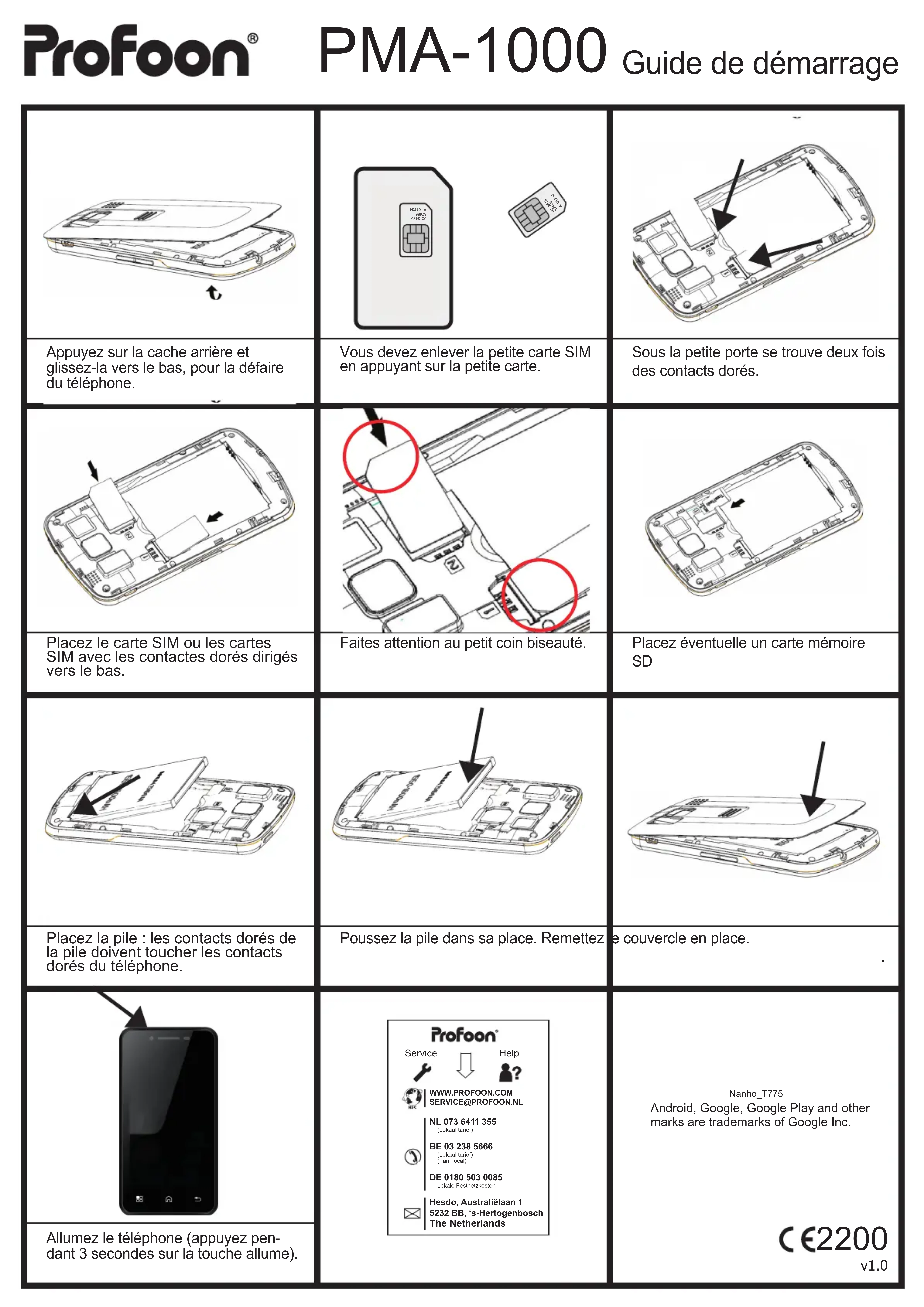 | Allumez le téléphone (appuyez pen-dant 3 secondes sur la touche allume). | Profoon Service Help http://www.PROFOON.COM SERVICE@PROFOON.NL NL 073 6411 355 (Lokall tare) BE 03 238 5666 (Lokall tare) (Teil local) DE 0180 503 0085 Lokale Fördmetablonen Hesdo, Australiølaan 1 5232 BB, 's-Hertogenbosch The Netherlands | Nanho_T775 Android, Google, Google Play and other marks are trademarks of Google Inc. €2200 v1.0 |
