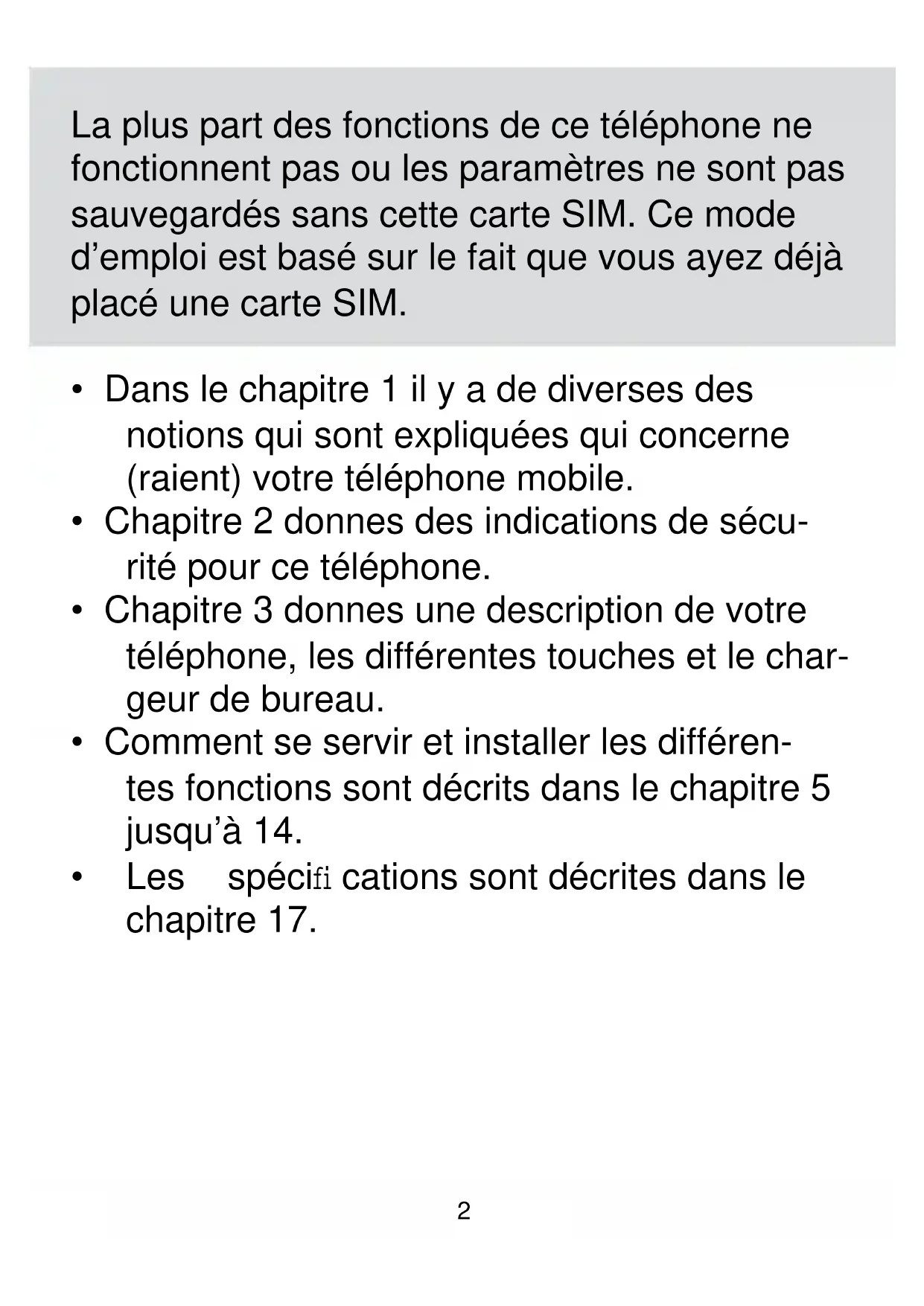 La plus part des fonctions de ce téléphone ne fonctionnent pas ou les paramètres ne sont pas sauvégardés sans cette carte SIM. Ce mode d'emploi est basé sur le fait que vous ayez déjà place une carte SIM.