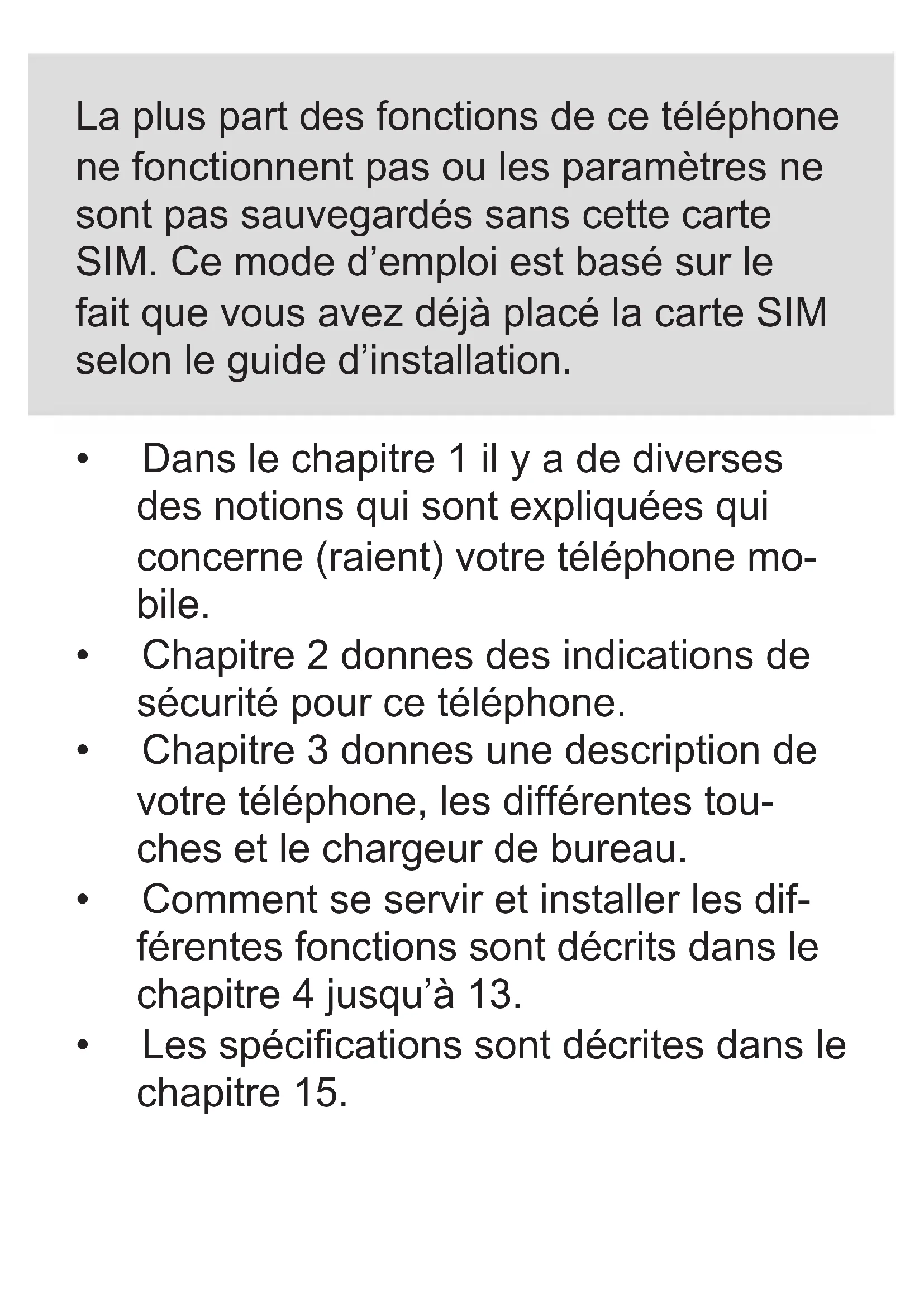 La plus part des fonctions de ce téléphone ne fonctionnent pas ou les paramètres ne sont pas sauvegardés sans cette carte SIM. Ce mode d'emploi est basé sur le fait que vous avez déjà placé la carte SIM selon le guide d'installation.
