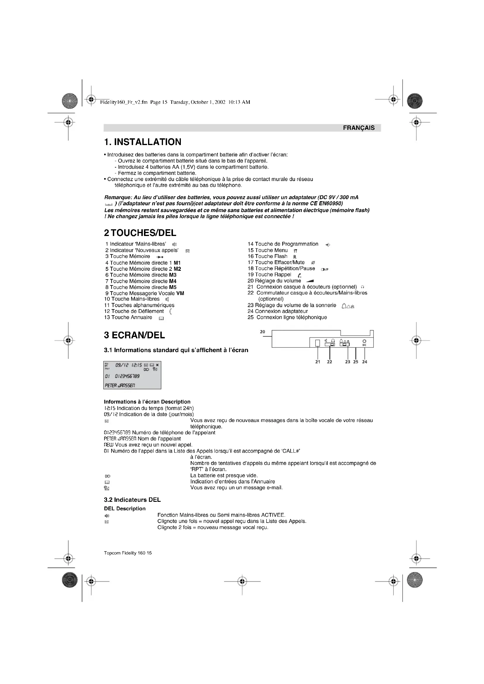 DEL Description Fonction Mains-libres ou Semi mains-libres ACTIVEE. Clignote une fois = nouvel appel reçu dans la Liste des Appels. Clignote 2 fois = nouveau message vocal reçu. 1 Indicateur ‘Mains-libres’ 2 Indicateur ‘Nouveaux appels’ 3 Touche Mémoire 4 Touche Mémoire directe 1 M1 5 Touche Mémoire directe 2 M2 6 Touche Mémoire directe M3 7 Touche Mémoire directe M4 8 Touche Mémoire directe M5 9 Touche Messagerie Vocale VM 10 Touche Mains-libres 11 Touches alphanumériques 12 Touche de Défilement 13 Touche Annuaire 14 Touche de Programmation 15 Touche Menu 16 Touche Flash 17 Touche Effacer/Mute 18 Touche Répétition/Pause 19 Touche Rappel 20 Réglage du volume 21 Connexion casque à écouteurs (optionnel) 22 Commutateur casque à écouteurs/Mains-libres (optionnel) 23 Réglage du volume de la sonnerie 24 Connexion adaptateur 25 Connexion ligne téléphonique Fidelity160_Fr_v2.fm Page 15 Tuesday, October 1, 2002 10:13 AM16 Topcom Fidelity 160 FRANÇAIS 4 FONCTIONNEMENT