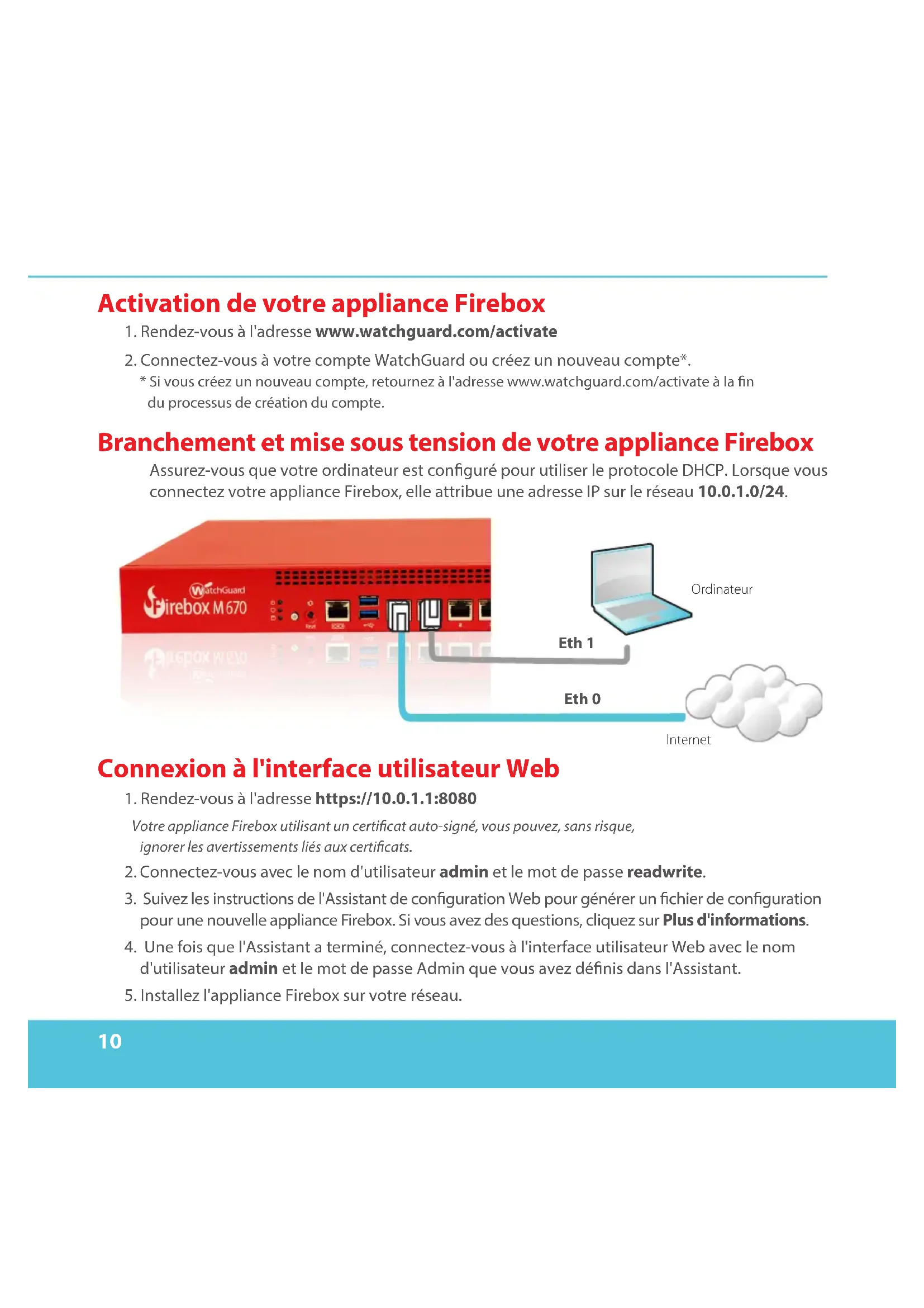 - Si vous créez un nouveau compte, retournez à l'adresse www.watchguard.com/activate à la n duprocessus de création du compte. Branchement et mise sous tension de votre appliance Firebox Assurez-vous que votre ordinateur est conguré pour utiliser le protocole DHCP. Lorsque vous connectez votre appliance Firebox, elle attribue une adresseIP sur le réseau 10.0.1.0/24.