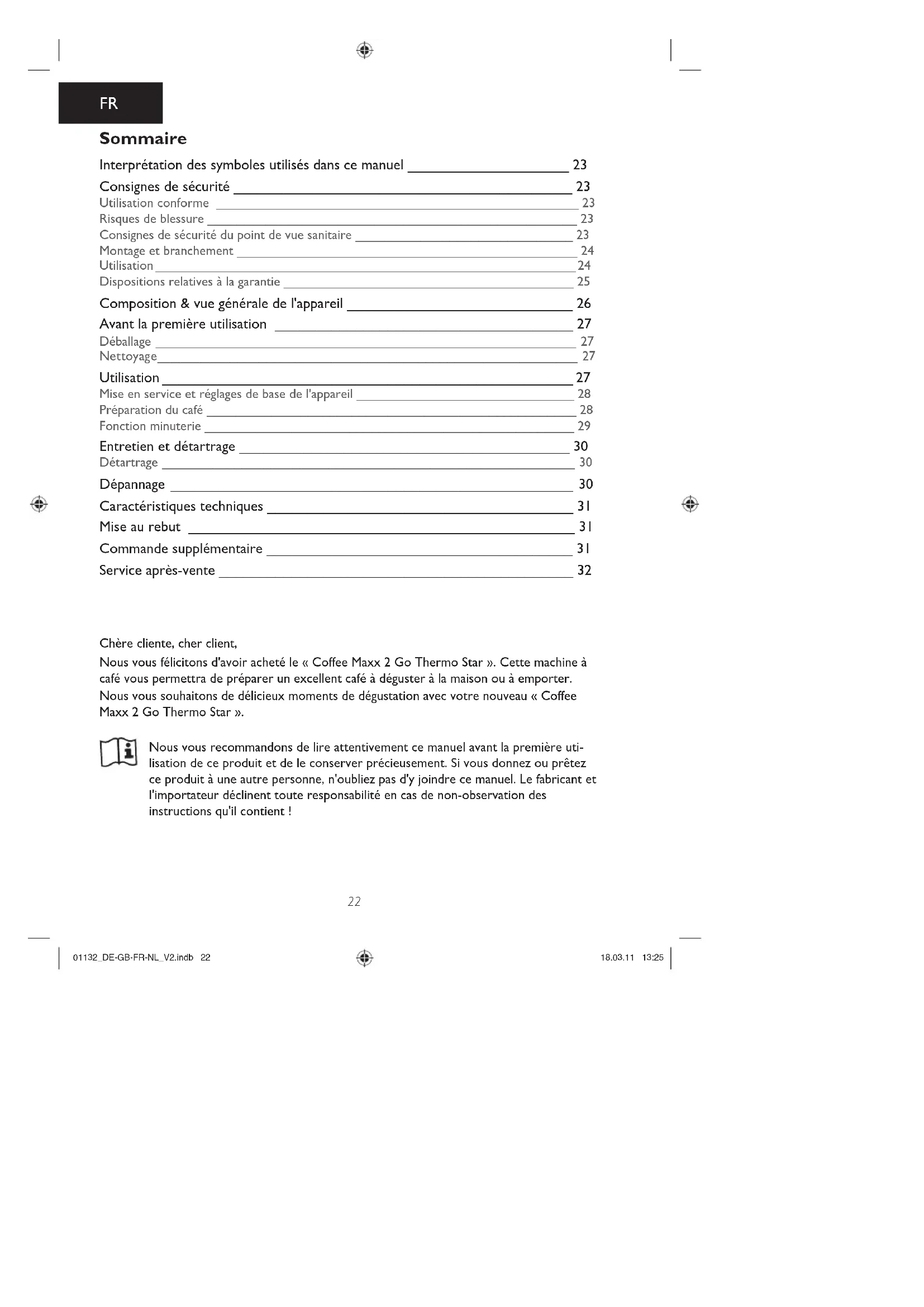 Sommaire Interprétation des symboles utilisés dans ce manuel ____________________ 23 Consignes de sécurité __________________________________________ 23 Utilisation conforme __________________________________________________ 23 Risques de blessure ___________________________________________________ 23 Consignes de sécurité du point de vue sanitaire ______________________________ 23 Montage et branchement _______________________________________________ 24 Utilisation __________________________________________________________ 24 Dispositions relatives à la garantie ________________________________________ 25 Composition & vue générale de l'appareil ____________________________ 26 Avant la première utilisation _____________________________________ 27 Déballage __________________________________________________________ 27 Ne t toy ag e __________________________________________________________ 27 Utilisation ___________________________________________________ 27 Mise en service et réglages de base de l'appareil ______________________________ 28 Préparation du café ___________________________________________________ 28 Fonction minuterie ___________________________________________________ 29 Entretien et détartrage _________________________________________ 30 Détartrage _________________________________________________________ 30 Dépannage __________________________________________________ 30 Caractéristiques techniques ______________________________________ 31 Mise au rebut ________________________________________________ 31 Commande supplémentaire ______________________________________ 31 Service après-vente ____________________________________________ 32 01132_DE-GB-FR-NL_V2.indb 2201132_DE-GB-FR-NL_V2.indb 22 18.03.11 13:2518.03.11 13:2523 Interprétation des symboles utilisés dans ce manuel Ce symbole attire l'attention sur toutes les consignes de sécurité. Lisez attentivement ces consignes de sécurité et observez-les minutieusement afi n d'éviter tout risque de blessure ou de dégâts matériels. Ce symbole signale les conseils et les recommandations. Pour usage alimentaire. Consignes de sécurité Utilisation conforme ❐ L'appareil est destiné à la préparation du café. ❐ L'appareil n'est pas conçu pour une utilisation avec un minuteur auxiliaire ou un système de commande à distance externe. ❐ L'appareil est conçu pour un usage exclusivement domestique, non professionnel. ❐ Ce produit doit être utilisé uniquement comme indiqué dans le présent manuel. Toute autre utilisation est considérée comme non conforme. Risques de blessure ❐ Ne laissez pas l'appareil ni les emballages à la portée des enfants ou des animaux. ❐ Ce produit n'est pas conçu pour une utilisation par des personnes (enfants compris) ne disposant pas de toute leur intégrité sensorielle ou mentale ou bien manquant d'expérience ou de connaissances. De telles personnes ne peuvent utiliser ce produit que sous la surveillance d'un adulte chargé de leur sécurité et qui leur expliquera le cas échéant comment s'en servir. Surveillez les enfants pour vous assurer qu'ils ne jouent pas avec cet appareil. ❐ Risque de brûlure ! Pendant l'utilisation, de la vapeur brûlante s'échappe de l'appareil. Evitez tout contact avec la vapeur d'eau brûlante ! ❐ Risque de brûlure ! Certaines parties de l'appareil deviennent très chaudes du fait de son utilisation. Evitez tout contact avec les parties chaudes de l'appareil ! Consignes de sécurité du point de vue sanitaire ❐ Risques sanitaires liés à un manque de propreté ! Nettoyez l'appareil avant la première utilisation. Il peut en effet être contaminé par des résidus de production. Il faut alors impérativement respecter les consignes de nettoyage des paragraphes intitulés « Avant la première utilisation » et « Entretien et détartrage ». 01132_DE-GB-FR-NL_V2.indb 2301132_DE-GB-FR-NL_V2.indb 23 18.03.11 13:2518.03.11 13:2524 Montage et branchement ❐ Utilisez l'appareil uniquement dans une pièce fermée. ❐ Placez l'appareil sur une surface sèche, plane, solide et résistante à la chaleur. ❐ Pour ne pas risquer d'endommager l'appareil, assurez-vous qu'il se trouve à une distance suffi sante de toute source de chaleur, par ex. des plaques de cuisson ou d'un four. ❐ Branchez l'appareil uniquement sur une prise installée de façon réglementaire et mise à la terre. La prise doit rester facilement accessible même après le branchement. La tension du secteur doit correspondre aux caractéristiques techniques de l'appareil. Utilisez uniquement des rallonges conformes dont les caractéristiques techniques correspondent à celles de l'appareil. ❐ Afi n que personne ne risque de trébucher, veillez à ce que les câbles branchés ne gênent pas le passage. Ne laissez pas le câble pendre en bord de table ou le long de plans de travail à la cuisine. Quelqu'un pourrait y rester accroché et faire ainsi tomber l'appareil. ❐ Faites cheminer le câble de sorte qu'il ne soit ni pincé, ni coincé, et qu'il n'entre pas en contact avec des surfaces chaudes. Utilisation ❐ Avant chaque utilisation, vérifi ez que l'appareil ne présente aucun dommage. L'appareil ne doit pas être utilisé si le câble, la fi che ou l'appareil même présente des dommages apparents. N'utilisez pas l'appareil en cas de dysfonctionnement ou s'il est tombé. ❐ Si l'appareil est défectueux, n'essayez pas de le réparer vous-même. En cas de panne, contactez le service après-vente (voir le paragraphe « Service après-vente »). ❐ Retirez la fi che de la prise de courant – si l'appareil n'est pas utilisé pendant une période prolongée, – si un dysfonctionnement survient au cours de l'utilisation, – en cas d'orage, – avant de nettoyer l'appareil. ❐ Pour extraire la fi che de la prise de courant, tirez toujours sur la fi che, jamais sur le câble. ❐ Ne plongez jamais l'appareil dans l'eau ou dans un quelconque aut