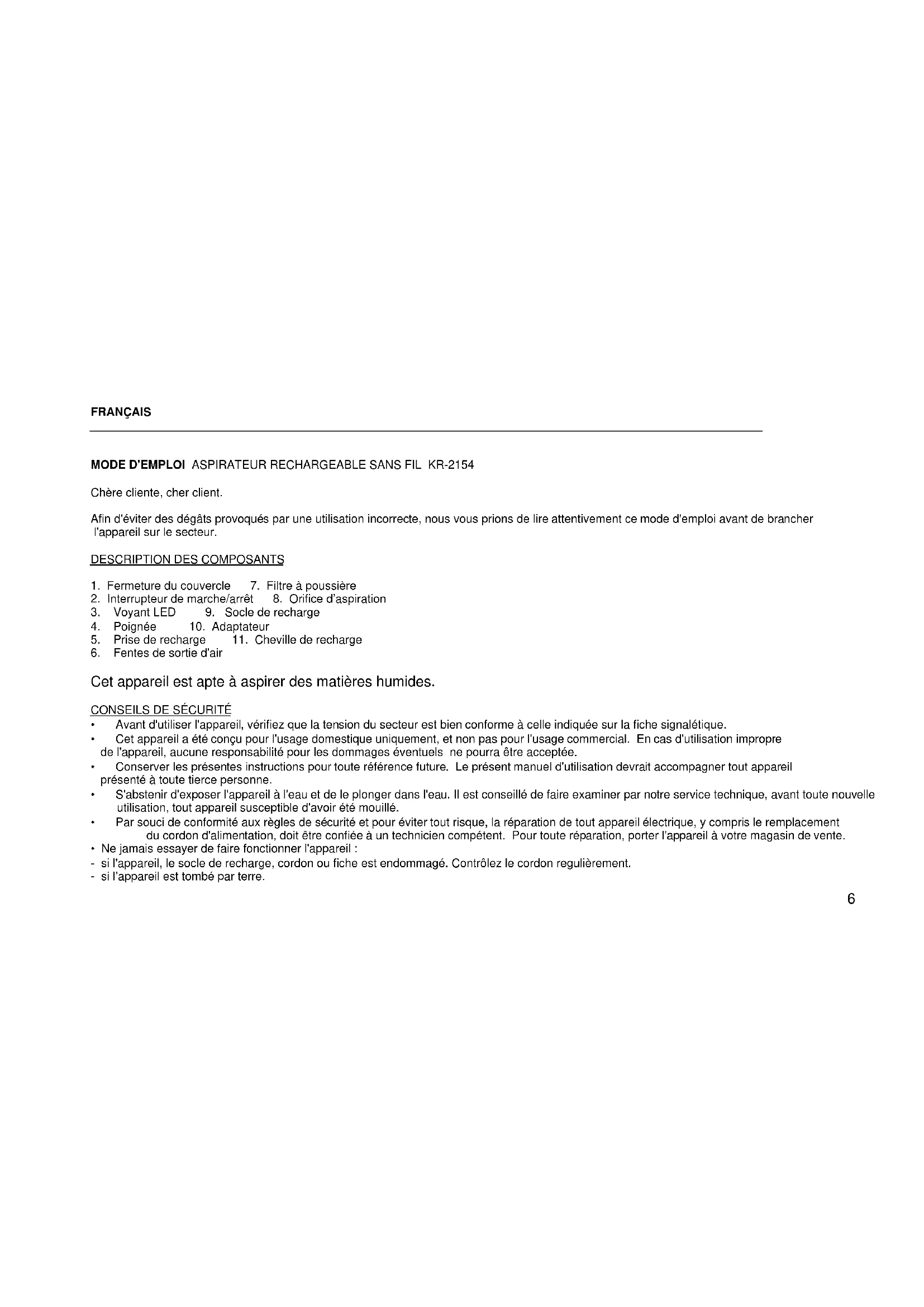 MODE D'EMPLOI ASPIRATEUR RECHARGEABLE SANS FIL KR-2154 Chère cliente, cher client. Afin d'éviter des dégâts provoqués par une utilisation incorrecte, nous vous prions de lire attentivement ce mode d'emploi avant de brancher l'appareil sur le secteur.