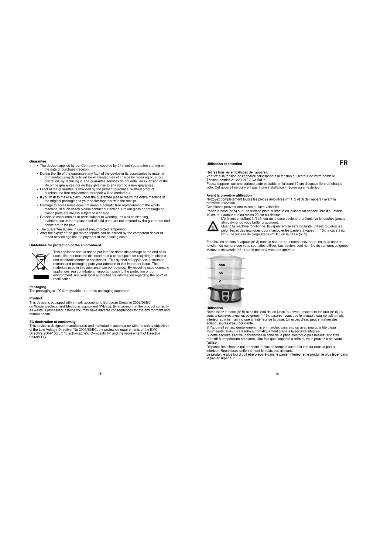 Les durées de caisson ci-dessus sont données à titre indicative, vous pouvez les adapter à votre goût. Nettoyage de l’appareil Débranchez l’appareil du secteur puis laissez toutes les pièces sécher. Nettoyez les paniers à vapeur (n° 3), la cuve à riz (n° 2), le couvercle ( n° 1) et le plateau d'égouttage (n° 10) à l’eau chaude savonneuse. Ces pièces peuvent être mises au lave-vaisselle. Ne plongez pas la base dans l'eau ou dans d'autres liquides. Ne lavez pas la base (n° 5) au lave-vaisselle, nettoyez-la avec un torchon humide. N’utilisez jamais de nettoyant fort ou abrasif, de tampon à récurer ou de paille de fer, qui pourraient endommager l’appareil. Vous devez régulièrement enlever le calcaire de l’appareil. Versez environ 0,7 litre de vinaigre dans la base et posez le premier panier à vapeur avec le couvercle sur la base. Allumez l’appareil et laissez-le allumé pendant environ 20 minutes. Rincez complètement les pièces et remplissez la cuve d’eau, allumez l'appareil et laissez-le ainsi pendant environ 10 minutes. Rincez ensuite complètement les pièces amovibles et la base à l’eau propre puis laissez-les sécher.19