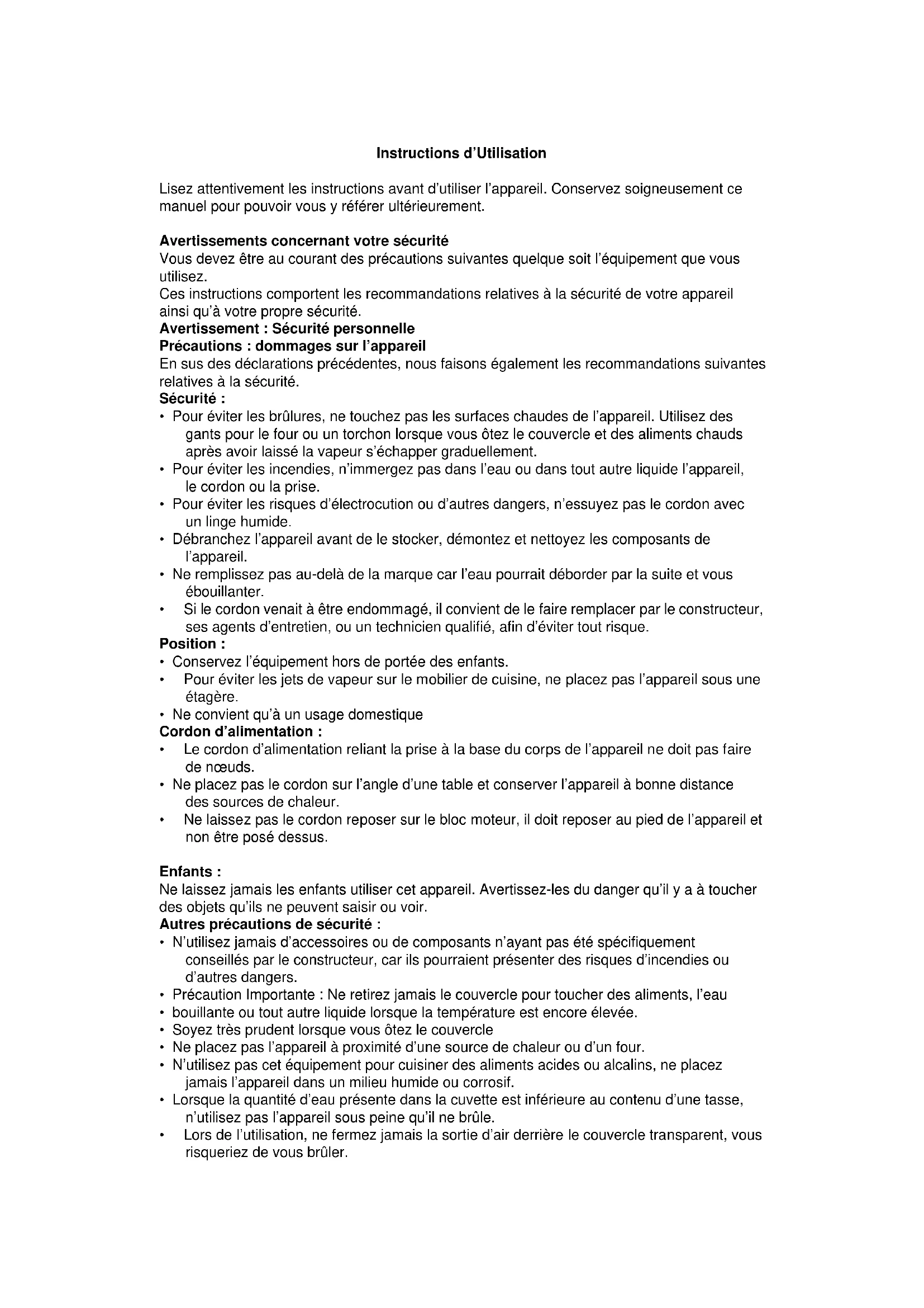 Utilisation combinée : Un panier vapeur : Utiliser un panier vapeur pour cuire les mêmes aliments (ex : pommes de terre pelées). Lorsque vous placez les aliments dans le panier, ne les laissez pas bloquer les orifices placés dans le fond du panier pour éviter que le cuiseur ne déborde. Deux paniers vapeur : Placez les aliments en plus grande quantité et avec le plus long temps de cuisson dans le panier vapeur du bas et les aliments cuisant rapidement dans celui du haut. Le jus peut s’écouler d’un panier à l’autre, prenez garde à ce que cela n’altère pas le goût des aliments. Trois paniers vapeur : Placez toujours la quantité de nourriture la plus importante et avec le plus long temps de cuisson dans le panier du bas. Le temps de cuisson vapeur pour les aliments placés dans le panier supérieur et généralement légèrement supérieur à 3-5 minutes car les aliments placés dans ce panier ont besoin de d’avantage de temps pour atteindre la bonne température. Si vous cuisinez en même temps différents types d’aliments vous devez placez ceux qui ont le plus long temps de cuisson dans le panier du bas, par exemple, si vous cuisinez en même temps de la viande, du poisson ou de la volaille et des légumes, placez toujours la viande, le poisson ou la volaille dans le panier du bas afin que le jus de la viande, du poisson ou de la volaille, nature ou non, ne se répandent pas sur les autres aliments. Ajouter plus d’eau Ajouter de l’eau si l’appareil fonctionne depuis longtemps.Riz vapeur L’appareil utilisé pour cuire le riz vous permet de bénéficier d’une cuisson particulièrement bonne.
