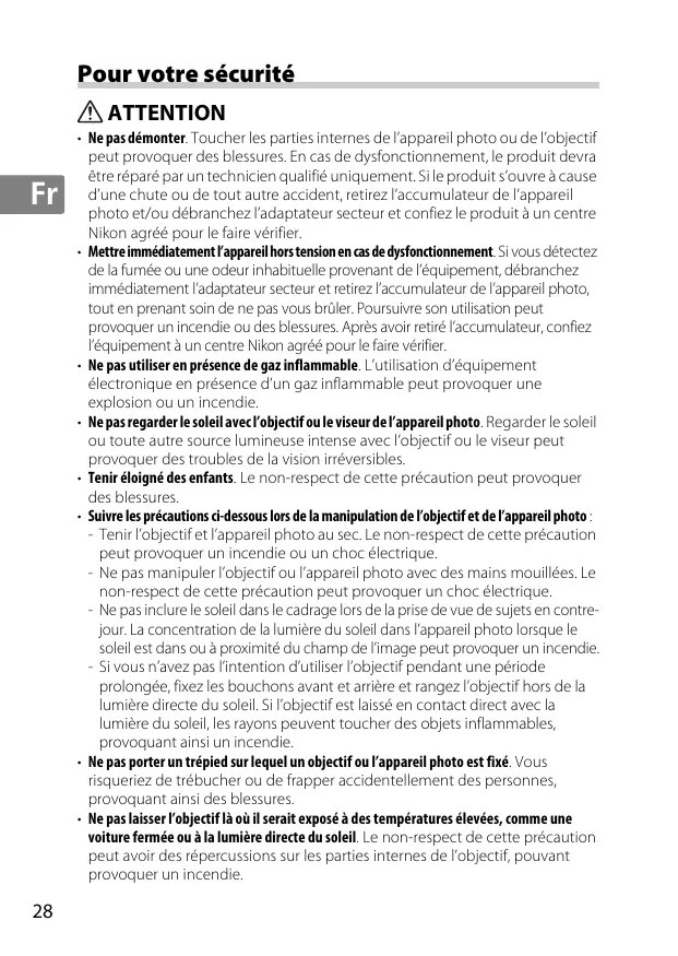 être réparé par un technicien qualifié uniquement. Si le produit s’ouvre à cause d’une chute ou de tout autre accident, retirez l’accumulateur de l’appareil photo et/ou débranchez l’adaptateur secteur et confiez le produit à un centre Nikon agréé pour le faire vérifier. • Mettre immédiatement l’appareil hors tension en cas de dysfonctionnement. Si vous détectez de la fumée ou une odeur inhabituelle provenant de l’équipement, débranchez immédiatement l’adaptateur secteur et retirez l’accumulateur de l’appareil photo, tout en prenant soin de ne pas vous brûler. Poursuivre son utilisation peut provoquer un incendie ou des blessures. Après avoir retiré l’accumulateur, confiez l’équipement à un centre Nikon agréé pour le faire vérifier. • Ne pas utiliser en présence de gaz inflammable. L’utilisation d’équipement électronique en présence d’un gaz inflammable peut provoquer une explosion ou un incendie. • Ne pas regarder le soleil avec l’objectif ou le viseur de l’appareil photo. Regarder le soleil ou toute autre source lumineuse intense avec l’objectif ou le viseur peut provoquer des troubles de la vision irréversibles. • Tenir éloigné des enfants. Le non-respect de cette précaution peut provoquer des blessures. • Suivre les précautions ci-dessous lors de la manipulation de l’objectif et de l’appareil photo : - Tenir l’objectif et l’appareil photo au sec. Le non-respect de cette précaution peut provoquer un incendie ou un choc électrique. - Ne pas manipuler l’objectif ou l’appareil photo avec des mains mouillées. Le non-respect de cette précaution peut provoquer un choc électrique. - Ne pas inclure le soleil dans le cadrage lors de la prise de vue de sujets en contrejour. La concentration de la lumière du soleil dans l’appareil photo lorsque le soleil est dans ou à proximité du champ de l’image peut provoquer un incendie. - Si vous n’avez pas l’intention d’utiliser l’objectif pendant une période prolongée, fixez les bouchons avant et arrière et rangez l’objectif hors de la lumière directe du soleil. Si l’objectif est laissé en contact direct avec la lumière du soleil, les rayons peuvent toucher des objets inflammables, provoquant ainsi un incendie. • Ne pas porter un trépied sur lequel un objectif ou l’appareil photo est fixé. Vous risqueriez de trébucher ou de frapper accidentellement des personnes, provoquant ainsi des blessures. • Ne pas laisser l’objectif là où il serait exposé à des températures élevées, comme une voiture fermée ou à la lumière directe du soleil. Le non-respect de cette précaution peut avoir des répercussions sur les parties internes de l’objectif, pouvant provoquer un incendie.