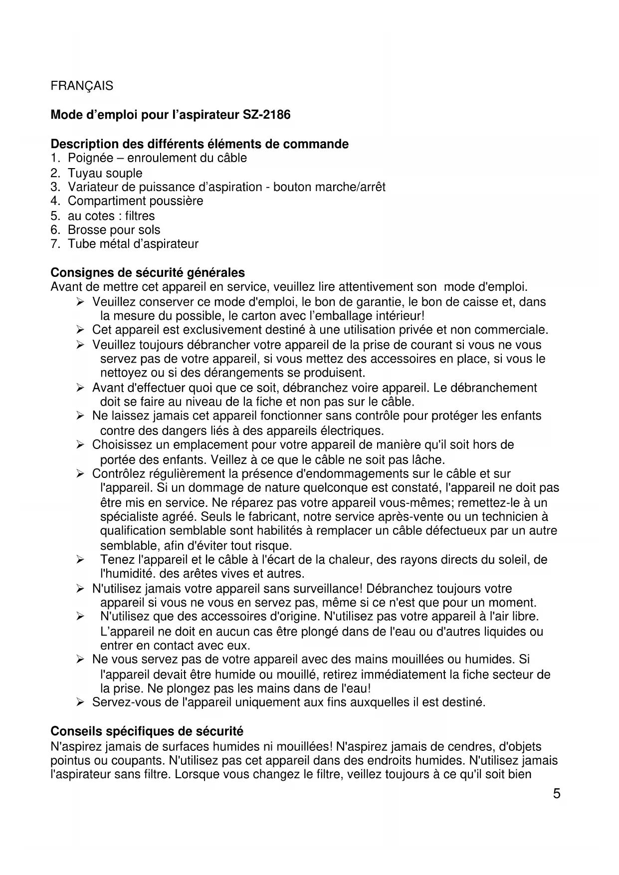 +++++5 FRANÇAIS Mode d’emploi pour l’aspirateur SZ-2186 Description des différents éléments de commande