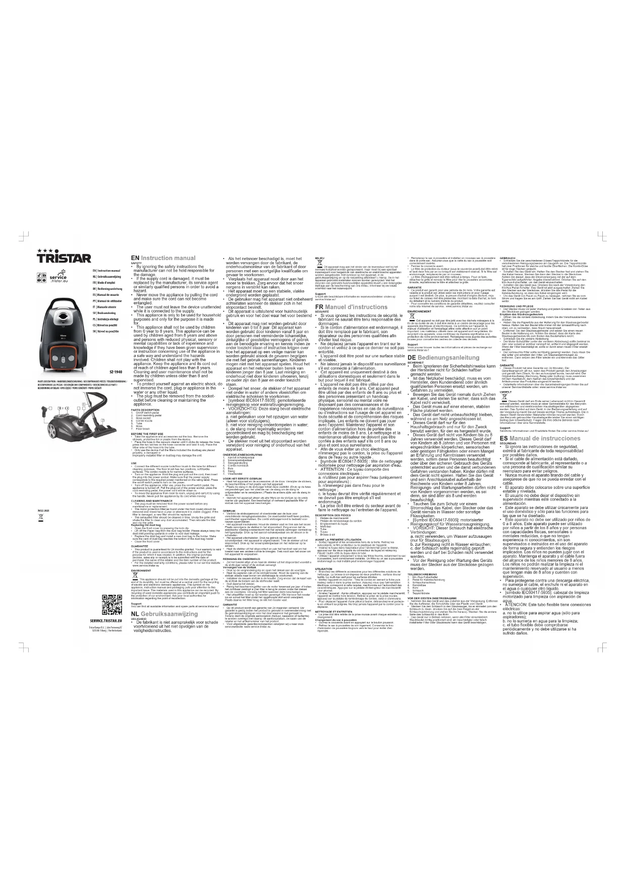 - Laprisedoitêtreenlevédusecteuravantde fairelenettoyageoul’entretiendel’appareil. DESCRIPTIONDESPIÈCES1. Pédaledemarche/arrêt2. Pédalederembobinageducordon3. Emplacementdutuyau4. Multibec5. Tube6. Tuyau7. BrosseàsolAVANTLAPREMIÈREUTILISATION• Sortezl'appareiletlesaccessoireshorsdelaboîte.Retirezlesautocollants,lefilmprotecteurouleplastiquedel'appareil.• Insérezletuyaudansl'aspirateurpourl'enclencher(pourlelibérer,appuyezsurlesdeuxloquetsduconnecteurdetuyauetretirezle).Placezl’autrecôtédutuyaudansletube.• Utilisezl’appareiluniquementsitouslesfiltresfournis,notammentlesacàpoussière,sontcorrectementinstallés.Unfiltreouunsacàpoussièreendommagéoumalinstallépeutendommagerl’appareil.UTILISATION• Branchezlesdifférentsaccessoirespourlesdifférentessolutionsdenettoyage.Labrosseàsoldisposededeuxpositions:surfacedouce/textile.Lemultibecsertpourlessurfacesétroites.• Mettezl’appareilenmarche:Tirezlecordonenserrantlafichepuisinsérezcellecidanslaprisesecteur.Assurezvousquel'alimentationélectriquecorrespondàcellerequise,mentionnéesurl'autocollantdescaractéristiques.Appuyezsurlapédaled'interrupteurdemarche/arrêtpourallumer.• Arretezl’appareil:Aprèsutilisation,appuyezsurlapédalemarche/arrêt,l'appareilsemettrahorstension.Retirezlaprisedelaprisemurale,appuyezsurlapédalederembobinageducordon,celuicis'enroulera.• Pourdéplacerl'appareild'unepièceàl'autre,débranchezleetportezeleenutilisantsapoignée.Netirezjamaisl'appareilparlecordonpourledéplacer.NETTOYAGEETENTRETIEN• Laprisedoitêtreretiréedelaprisemuraleavantchaqueentretienouchangement.Changementdusacàpoussière• Ouvrezlecouvercleavantenappuyantsurleboutonpoussoir.• Retirezlesacàpoussièredesonlogement.Conservezletroud'admissiondepoussièretoujoursverslehautpouréviterd'enrependre.• Remplacezlesacàpoussièreetinstallezunnouveausacàpoussièredansleportesac.Assurezvousquelacartedusacàpoussièresoitcorrectementinsérée.• Fermezlecouvercleavant.• Lefiltredeprotectiondumoteur(souslecouvercleavant)doitêtreretiréetlavédeuxfoisparanoulorsqu'ilestvisiblementobstrué.Silefiltreestendommagé,remplacezleparunnouveau.• Lefiltred'échappementdoitêtrenettoyéàtemps.Pourcefaire,détachezlagrilleetremuezlefiltrepourôterlapoussièreaccumulée.Ensuite,repositionnezlefiltreetattachezlagrille.GARANTIE• Ceproduitestgarantipourunepériodede24mois.Votregarantieestvalablesileproduitestutiliséselonlesinstructionsetpourl'usageauquelilestdestiné.Deplus,lapreuved'achatd'origine(facture,reçuouticketdecaisse)doitêtreprésentée,montrantladated'achat,lenomdudétaillantetlenumérod'articleduproduit.• Pourconnaîtrelesconditionsdegarantiedétaillées,veuillezconsulternotresiteInternetdeservice:www.service.tristar.euENVIRONNEMENTCetappareilnedoitpasêtrejetéaveclesdéchetsménagersàlafindesaduréedevie,ildoitêtreremisàuncentrederecyclagepourlesappareilsélectriquesetélectroniques.Cesymbolesurl'appareil,lemanueld'utilisationetl'emballageattirevotreattentionsurunpointimportant.Lesmatériauxutilisésdanscetappareilsontrecyclables.Enrecyclantvosappareils,vouscontribuezdemanièresignificativeàlaprotectiondenotreenvironnement.Renseignezvousauprèsdesautoritéslocalespourconnaîtrelescentresdecollectedesdéchets.SupportVouspouveztrouvertouteslesinformationsetpiècesderechangesurservice.tristar.eu! DEBedienungsanleitung SICHERHEIT