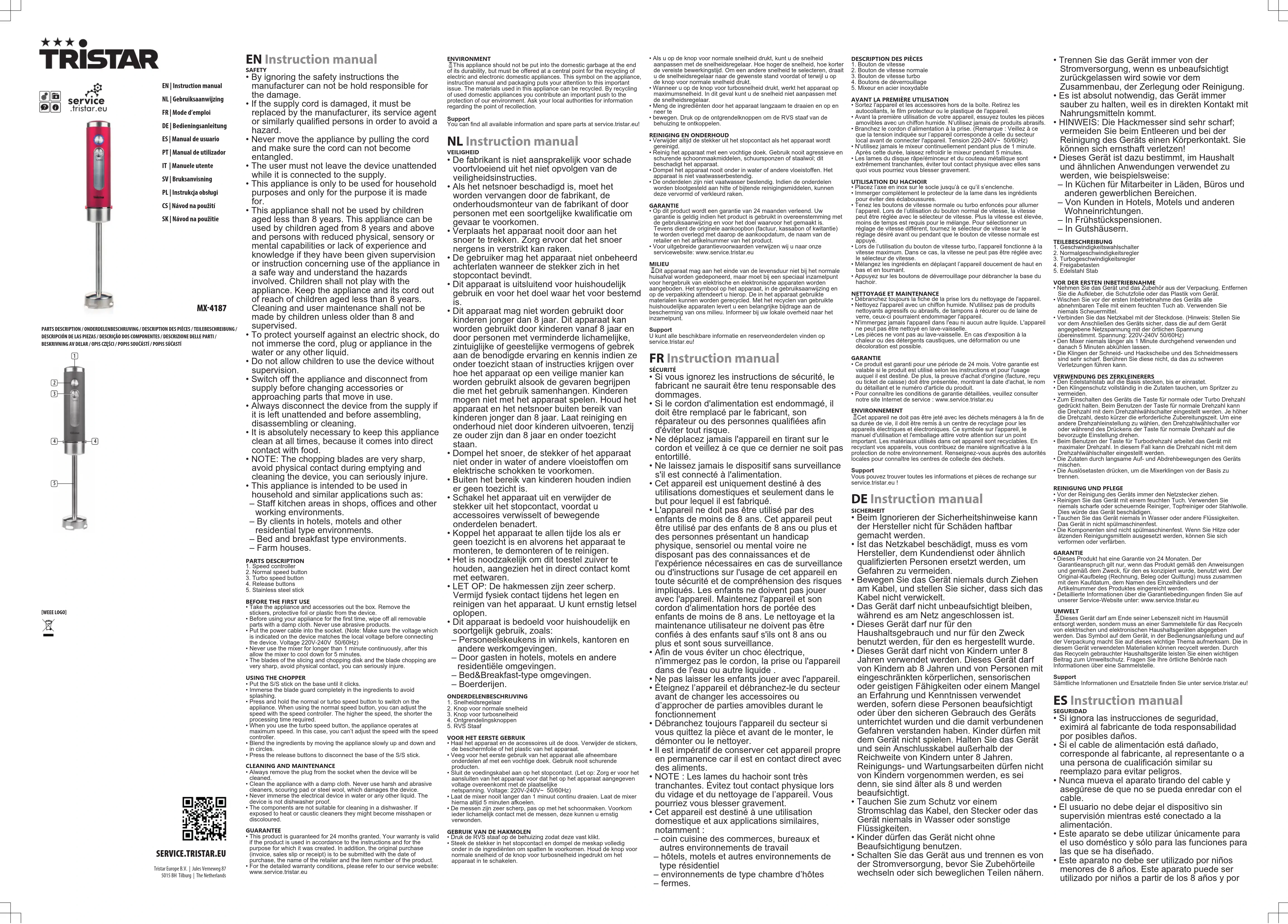 - Cet appareil est destiné à une utilisation domestique et aux applications similaires, notamment: – coin cuisine des commerces, bureaux et autres environnements de travail – hôtels, motels et autres environnements de type résidentiel – environnements de type chambre d’hôtes – fermes. DESCRIPTION DES PIÈCES1. Bouton de vitesse2. Bouton de vitesse normale3. Bouton de vitesse turbo4. Boutons de déverrouillage5. Mixeur en acier inoxydableAVANT LA PREMIÈRE UTILISATION• Sortez l'appareil et les accessoires hors de la boîte.Retirez lesautocollants, le film protecteur ou le plastique de l'appareil.• Avant la première utilisation de votre appareil, essuyez toutes les piècesamovibles avec un chiffon humide. N’utilisez jamais de produits abrasifs.• Branchez le cordon d’alimentation à la prise.(Remarque: Veillez à ceque la tension indiquée sur l’appareil corresponde à celle du secteurlocal avant de connecter l'appareil.Tension220-240V~ 50/60Hz)• N'utilisez jamais le mixeur continuellement pendant plus de 1 minute.Après cette durée, laissez refroidir le mixeur pendant 5 minutes.• Les lames du disque râpe/éminceur et du couteau métallique sontextrêmement tranchantes, éviter tout contact physique avec elles sansquoi vous pourriez vous blesser gravement.UTILISATION DU HACHOIR• Placez l’axe en inox sur le socle jusqu’à ce qu’il s’enclenche.• Immerger complètement le protecteur de la lame dans les ingrédientspour éviter des éclaboussures.• Tenez les boutons de vitesse normale ou turbo enfoncés pour allumerl’appareil. Lors de l’utilisation du bouton normal de vitesse, la vitessepeut être réglée avec le sélecteur de vitesse. Plus la vitesse est élevée,moins de temps est requis pour le mélange. Pour sélectionner unréglage de vitesse différent, tournez le sélecteur de vitesse sur leréglage désiré avant ou pendant que le bouton de vitesse normale estappuyé.• Lors de l’utilisation du bouton de vitesse turbo, l’appareil fonctionne à lavitesse maximum. Dans ce cas, la vitesse ne peut pas être réglée avecle sélecteur de vitesse.• Mélangez les ingrédients en déplaçant l’appareil doucement de haut enbas et en tournant.• Appuyez sur les boutons de déverrouillage pour débrancher la base duhachoir.NETTOYAGE ET MAINTENANCE• Débranchez toujours la fiche de la prise lors du nettoyage de l'appareil.• Nettoyez l'appareil avec un chiffon humide. N'utilisez pas de produitsnettoyants agressifs ou abrasifs, de tampons à récurer ou de laine deverre, ceux-ci pourraient endommager l'appareil.• N'immergez jamais l'appareil dans l'eau ni aucun autre liquide. L'appareilne peut pas être nettoyé en lave-vaisselle.• Les pièces ne vont pas au lave-vaisselle. En cas d'exposition à lachaleur ou des détergents caustiques, une déformation ou unedécoloration est possible.GARANTIE• Ce produit est garanti pour une période de 24 mois. Votre garantie estvalable si le produit est utilisé selon les instructions et pour l'usageauquel il est destiné. De plus, la preuve d'achat d'origine (facture, reçuou ticket de caisse) doit être présentée, montrant la date d'achat, le nomdu détaillant et le numéro d'article du produit.• Pour connaître les conditions de garantie détaillées, veuillez consulternotre site Internet de service: www.service.tristar.euENVIRONNEMENTCet appareil ne doit pas être jeté avec les déchets ménagers à la fin desa durée de vie, il doit être remis à un centre de recyclage pour lesappareils électriques et électroniques. Ce symbole sur l'appareil, lemanuel d'utilisation et l'emballage attire votre attention sur un pointimportant. Les matériaux utilisés dans cet appareil sont recyclables. Enrecyclant vos appareils, vous contribuez de manière significative à laprotection de notre environnement. Renseignez-vous auprès des autoritéslocales pour connaître les centres de collecte des déchets.SupportVous pouvez trouver toutes les informations et pièces de rechange surservice.tristar.eu! DEInstruction manual SICHERHEIT