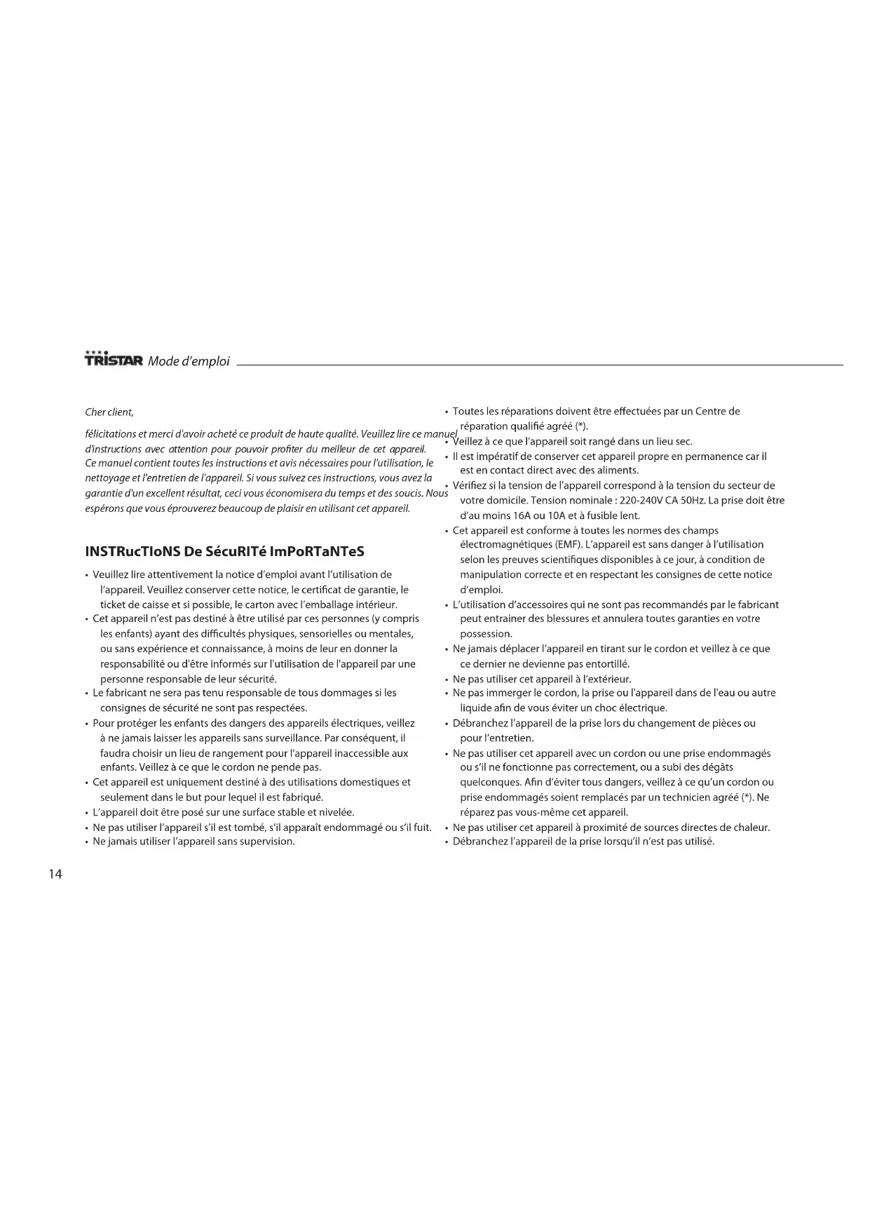 - Les dommages causés par le non respect de la notice d’emploi, entraineront l’annulation de la garantie, Tristar ne sera pas tenu responsable si des dégâts en résultent.