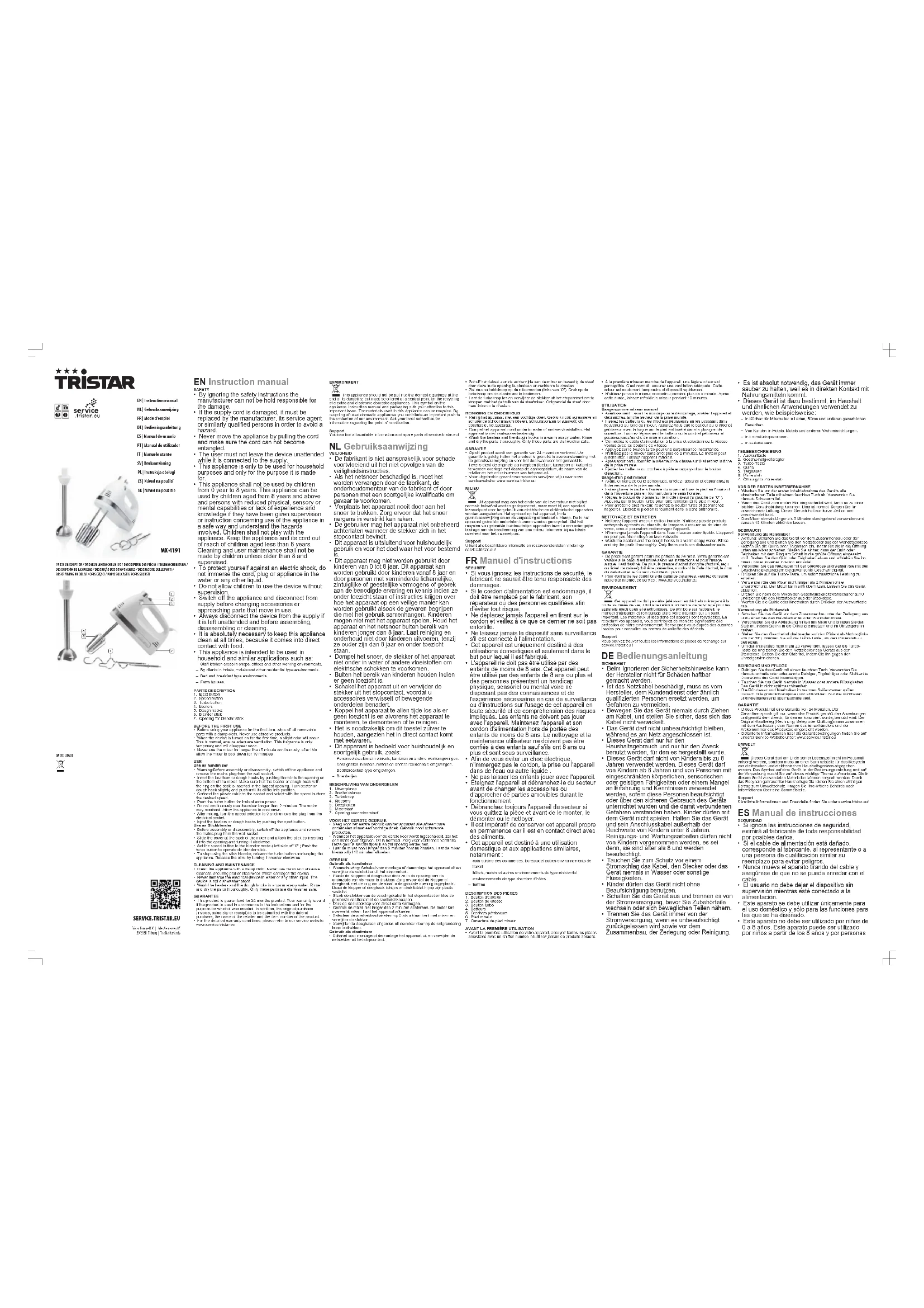 - Cetappareilestdestinéàuneutilisation domestiqueetauxapplicationssimilaires, notamment: – coincuisinedescommerces,bureauxetautresenvironnementsdetravail– hôtels,motelsetautresenvironnementsdetyperésidentiel– environnementsdetypechambred’hôtes– fermes.DESCRIPTIONDESPIÈCES1. Boutond'éjection2. Boutondevitesse3. Boutonturbo4. Batteurs5. Crochetspétrisseurs6. Piedmixeur7. OuverturedepiedmixeurAVANTLAPREMIÈREUTILISATION• Avantlapremièreutilisationdevotreappareil,essuyeztouteslespiècesamoviblesavecunchiffonhumide.N’utilisezjamaisdeproduitsabrasifs.• Àlapremièremiseenmarchedel'appareil,unelégèreodeurestperceptible.C'estnormal:assurezuneventilationadéquate.Cetteodeurestseulementtemporaireetdisparaîtrapidement.• N'utilisezjamaislemixeurencontinupendantplusde5minute.Aprèscettedurée,laissezrefroidirlemixeurpendant10minutes.UTILISATIONUsagecommemixeurmanuel• Avertissement:avantlemontageouledémontage,arrêtezl’appareiletdébranchezlafichesecteurdelaprisemurale.• Insérezlesbatteursoulescrochetspétrisseursenlespoussantdansl'ouvertureaufonddumixeur.Assurezvousquelebatteuroulecrochetpétrisseuraveclabaguesurlepiedestinsérédanslaplusgrandeouverture.Tournezlégèrementlebatteuroulecrochetpétrisseuretpoussezjusqu'auclicdemiseenposition.• Connectezlecâbled'alimentationàlapriseetsélectionnezlavitessevoulueaveclesboutonsdevitesse.• Appuyezsurleboutonturbopourunesurpuissanceinstantanée.• N'utilisezpaslemixeursansarrêtplusde2minutes.Lemoteurpeutsurchauffer.Laissezl'appareilrefroidir.• Aprèsavoirbattu,tournezlesélecteurdevitessesur0etretirezlafichedelaprisemurale.• Éjectezlesbatteursoucrochetsàpâteenappuyantsurleboutond'éjection.Usaged'unpiedmixeur• Avantlemontageouledémontage,arrêtezl’appareiletdébranchezlafichesecteurdelaprisemurale.• Faitesglisserlecacheàl'arrièredumixeuretfixezlepiedenl'insérantdansl'ouverturepuisentournantdanslesenshoraire.• Réglezleboutondevitessesurlemodemixeur(àgauchede"0").Appuyezsurleboutonturbopourfairefonctionnerlepiedmixeur.• Pourarrêterlepiedmixeur,relâchezleboutonturboetdébranchezl'appareil.Libérezlepiedenletournantdanslesensantihoraire.NETTOYAGEETENTRETIEN• Nettoyezl'appareilavecunchiffonhumide.N'utilisezpasdeproduitsnettoyantsagressifsouabrasifs,detamponsàrécureroudelainedeverre,ceuxcipourraientendommagerl'appareil.• N'immergezjamaisl'appareildansl'eauniaucunautreliquide.L'appareilnepeutpasêtrenettoyéenlavevaisselle.• Washthebeatersandthedoughhooksinawarmsoapywater.Rinseanddrythepartsthouroughly.Onlythesepartsaredishwashersafe.GARANTIE• Ceproduitestgarantipourunepériodede24mois.Votregarantieestvalablesileproduitestutiliséselonlesinstructionsetpourl'usageauquelilestdestiné.Deplus,lapreuved'achatd'origine(facture,reçuouticketdecaisse)doitêtreprésentée,montrantladated'achat,lenomdudétaillantetlenumérod'articleduproduit.• Pourconnaîtrelesconditionsdegarantiedétaillées,veuillezconsulternotresiteInternetdeservice:www.service.tristar.euENVIRONNEMENTCetappareilnedoitpasêtrejetéaveclesdéchetsménagersàlafindesaduréedevie,ildoitêtreremisàuncentrederecyclagepourlesappareilsélectriquesetélectroniques.Cesymbolesurl'appareil,lemanueld'utilisationetl'emballageattirevotreattentionsurunpointimportant.Lesmatériauxutilisésdanscetappareilsontrecyclables.Enrecyclantvosappareils,vouscontribuezdemanièresignificativeàlaprotectiondenotreenvironnement.Renseignezvousauprèsdesautoritéslocalespourconnaîtrelescentresdecollectedesdéchets.SupportVouspouveztrouvertouteslesinformationsetpiècesderechangesurservice.tristar.eu!