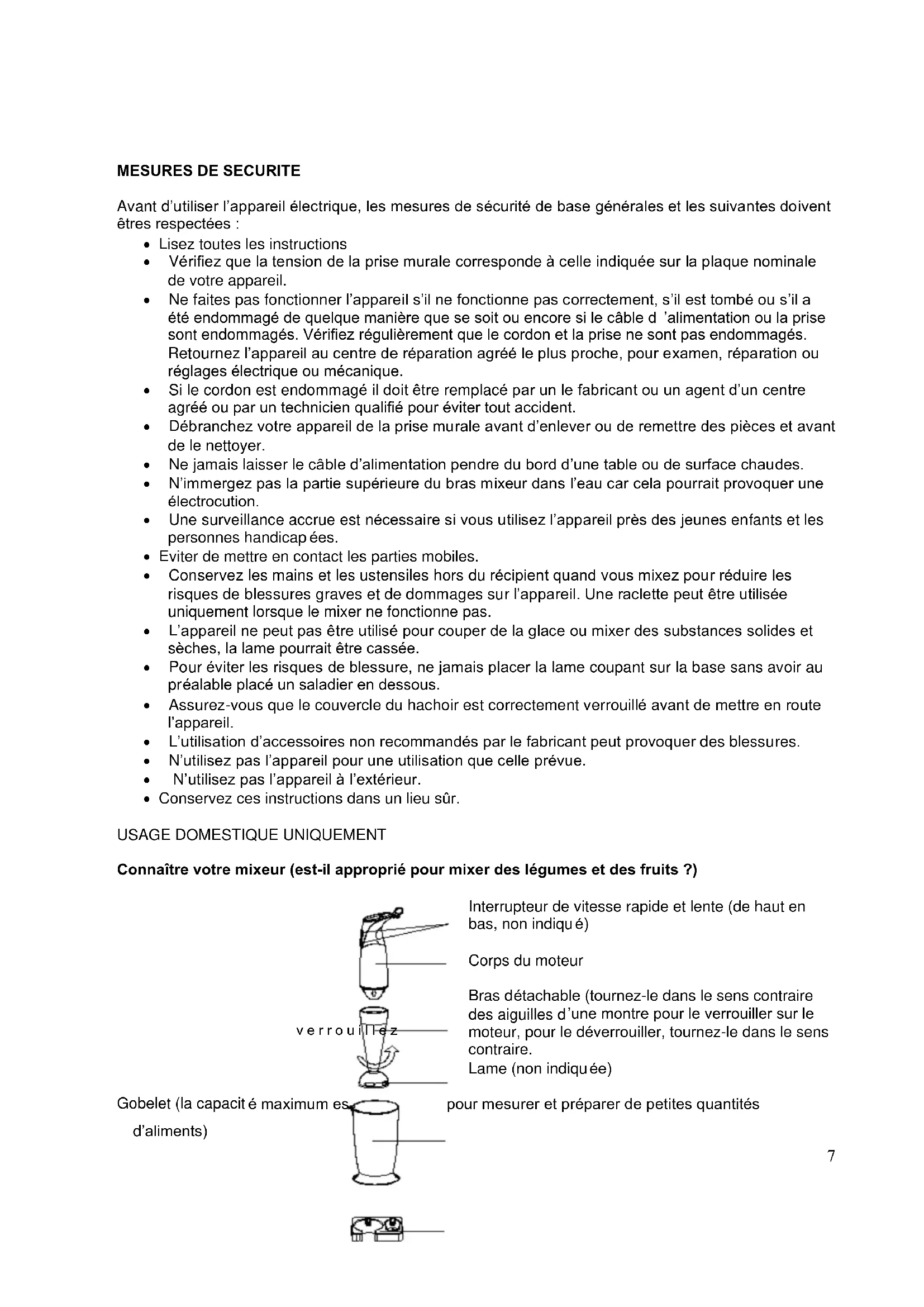 Avant d’utiliser l’appareil électrique, les mesures de sécurité de base générales et les suivantes doivent êtres respectées : Lisez toutes les instructions Vérifiez que la tension de la prise murale corresponde à celle indiquée sur la plaque nominale de votre appareil. Ne faites pas fonctionner l’appareil s’il ne fonctionne pas correctement, s’il est tombé ou s’il a été endommagé de quelque manière que se soit ou encore si le câble d ’alimentation ou la prise sont endommagés. Vérifiez régulièrement que le cordon et la prise ne sont pas endommagés. Retournez l’appareil au centre de réparation agréé le plus proche, pour examen, réparation ou réglages électrique ou mécanique. Si le cordon est endommagé il doit être remplacé par un le fabricant ou un agent d’un centre agréé ou par un technicien qualifié pour éviter tout accident. Débranchez votre appareil de la prise murale avant d’enlever ou de remettre des pièces et avant de le nettoyer. Ne jamais laisser le câble d’alimentation pendre du bord d’une table ou de surface chaudes. N’immergez pas la partie supérieure du bras mixeur dans l’eau car cela pourrait provoquer une électrocution. Une surveillance accrue est nécessaire si vous utilisez l’appareil près des jeunes enfants et les personnes handicap ées. Eviter de mettre en contact les parties mobiles. Conservez les mains et les ustensiles hors du récipient quand vous mixez pour réduire les risques de blessures graves et de dommages sur l’appareil. Une raclette peut être utilisée uniquement lorsque le mixer ne fonctionne pas. L’appareil ne peut pas être utilisé pour couper de la glace ou mixer des substances solides et sèches, la lame pourrait être cassée. Pour éviter les risques de blessure, ne jamais placer la lame coupant sur la base sans avoir au