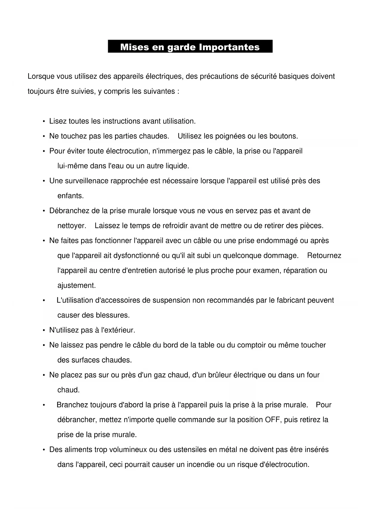 - Débranchez de la prise murale lorsque vous ne vous en servez pas et avant de nettoyer. Laissez le temps de refroidir avant de mettre ou de retirer des pièces.