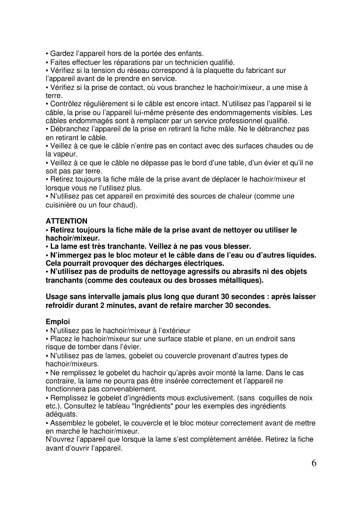 - Le hachoir/mixeur est destiné à l’usage ménager exclusivement; il n’est pas destiné à l’usage professionnel. Sécurité de l’appareil