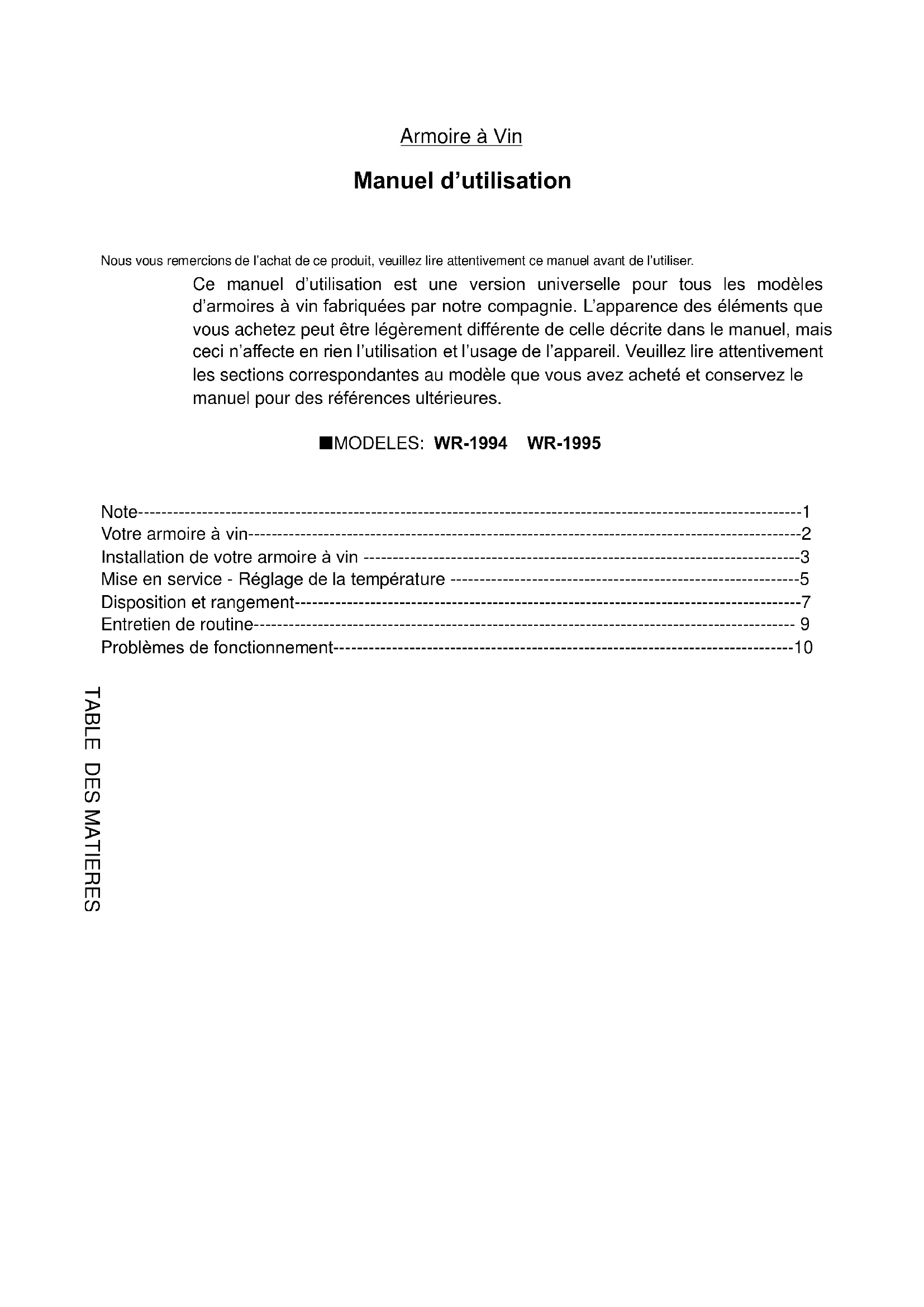 Nous vous remercions de l’achat de ce produit, veuillez lire attentivement ce manuel avant de l’utiliser. Ce manuel d’utilisation est une version universelle pour tous les modèles d’armoires à vin fabriquées par notre compagnie. L’apparence des éléments que vous achetez peut être légèrement différente de celle décrite dans le manuel, mais ceci n’affecte en rien l’utilisation et l’usage de l’appareil. Veuillez lire attentivement les sections correspondantes au modèle que vous avez acheté et conservez le manuel pour des références ultérieures.