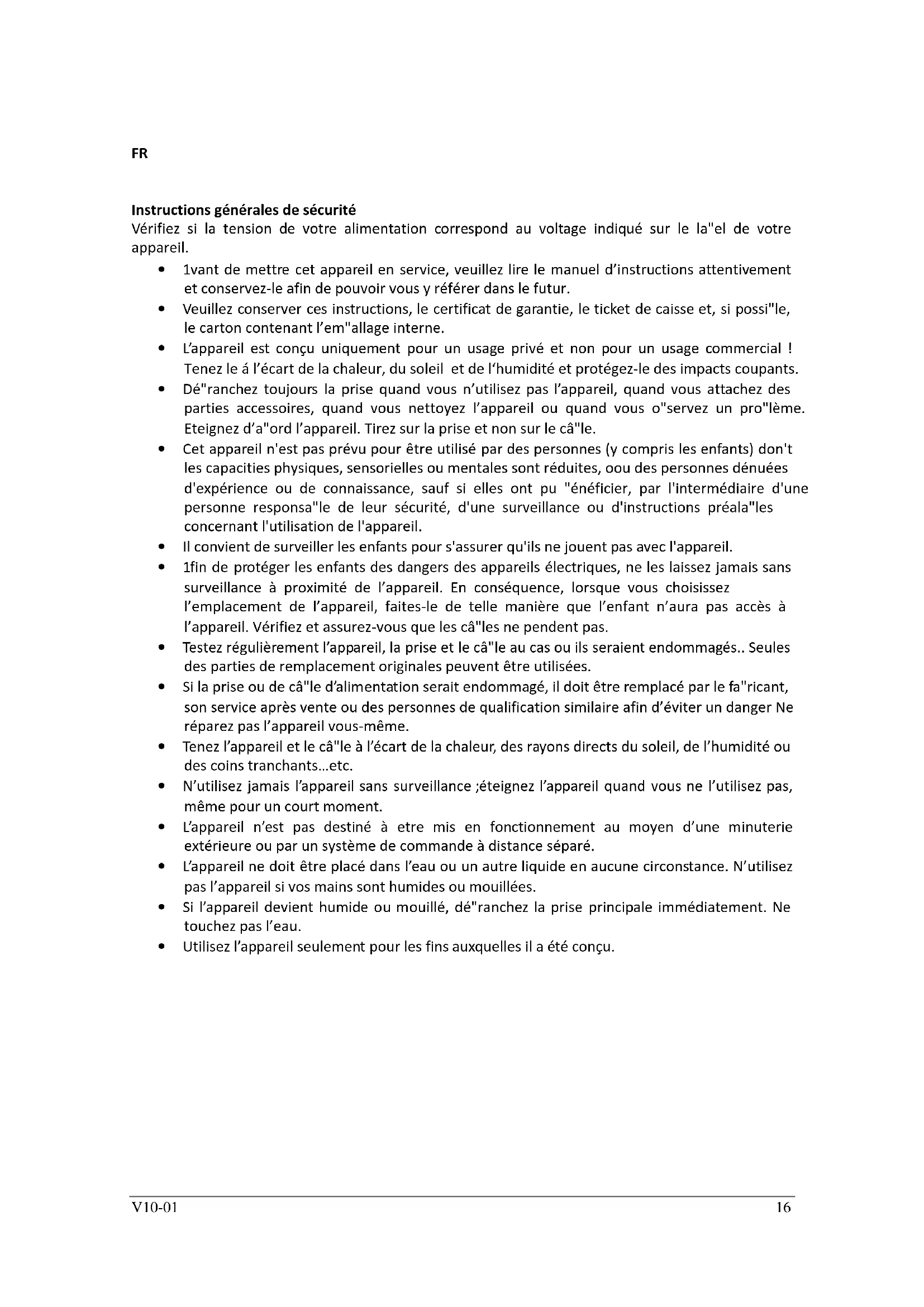- Utilisez l’appareil seulement pour les fins auxquelles il a été conçu.V10-01 17 Précautions Veuillez lire attentivement le Manuel d'Instructions avant d'utiliser le produit. Veuillez suivre les instructions d'entretien pour un fonctionnement en toute sécurité et une meilleure durée de vie. Les informations contenues dans ce Manuel d'Instructions ne sont là que pour référence et les données fournies ne conviennent qu'à la valeur nominale. Pour éviter tout accident, veuillez respecter les consignes de sécurité suivantes : Vérifiez que l'alimentation corresponde à la tension indiquée sur l'étiquette avant de mettre l'appareil sous tension. L'appareil doit être branché à une prise de courant murale disposant d'une prise de terre. L'appareil et les fils ne doivent pas toucher de surfaces extrêmement chaudes ou du feu. Desserrer les câbles de torsion est dangereux. Vérifiez qu'il n'y ait pas de matériaux inflammables à côté ou au dessus de l'appareil. Placez l'appareil à au moins 30cm des murs. Les enfants ne doivent pas toucher l'appareil. Faites attention lorsque vous l'utilisez et qu'il y a des enfants à proximité! Évitez le contact entre la grille et l'élément chauffant, sinon cela pourrait provoquer des dégats. Protégez le thermostat, le fil et la prise de l'appareil contre la pluie. Veuillez ne pas utiliser l'appareil si le réflecteur n'est pas plongé dans l'eau. Débranchez l'appareil après utilisation ou avant de le nettoyer ou avant de le réparer. Le cordon d'alimentation doit être examiné régulièrement, s'il a été endommagé, l'appareil ne doit pas être utilisé. N'utilisez pas d'appareil électrique endommagé ou d'appareils ave un branchement endommagé. Pour éviter tout danger, veuillez demander aux techniciens professionnels de réparer l'appareil.