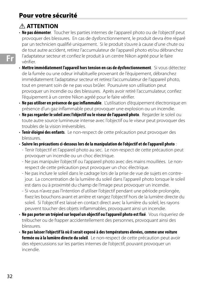 • Mettre immédiatement l’appareil hors tension en cas de dysfonctionnement. Si vous détectez de la fumée ou une odeur inhabituelle provenant de l’équipement, débranchez immédiatement l’adaptateur secteur et retirez l’accumulateur de l’appareil photo, tout en prenant soin de ne pas vous brûler. Poursuivre son utilisation peut provoquer un incendie ou des blessures. Après avoir retiré l’accumulateur, confiez l’équipement à un centre Nikon agréé pour le faire vérifier. • Ne pas utiliser en présence de gaz inflammable. L’utilisation d’équipement électronique en présence d’un gaz inflammable peut provoquer une explosion ou un incendie. • Ne pas regarder le soleil avec l’objectif ou le viseur de l’appareil photo. Regarder le soleil ou toute autre source lumineuse intense avec l’objectif ou le viseur peut provoquer des troubles de la vision irréversibles. • Tenir éloigné des enfants. Le non-respect de cette précaution peut provoquer des blessures. • Suivre les précautions ci-dessous lors de la manipulation de l’objectif et de l’appareil photo : - Tenir l’objectif et l’appareil photo au sec. Le non-respect de cette précaution peut provoquer un incendie ou un choc électrique. - Ne pas manipuler l’objectif ou l’appareil photo avec des mains mouillées. Le nonrespect de cette précaution peut provoquer un choc électrique. - Ne pas inclure le soleil dans le cadrage lors de la prise de vue de sujets en contrejour. La concentration de la lumière du soleil dans l’appareil photo lorsque le soleil est dans ou à proximité du champ de l’image peut provoquer un incendie. - Si vous n’avez pas l’intention d’utiliser l’objectif pendant une période prolongée, fixez les bouchons avant et arrière et rangez l’objectif hors de la lumière directe du soleil. Si l’objectif est laissé en contact direct avec la lumière du soleil, les rayons peuvent toucher des objets inflammables, provoquant ainsi un incendie. • Ne pas porter un trépied sur lequel un objectif ou l’appareil photo est fixé. Vous risqueriez de trébucher ou de frapper accidentellement des personnes, provoquant ainsi des blessures. • Ne pas laisser l’objectif là où il serait exposé à des températures élevées, comme une voiture fermée ou à la lumière directe du soleil. Le non-respect de cette précaution peut avoir des répercussions sur les parties internes de l’objectif, pouvant provoquer un incendie.