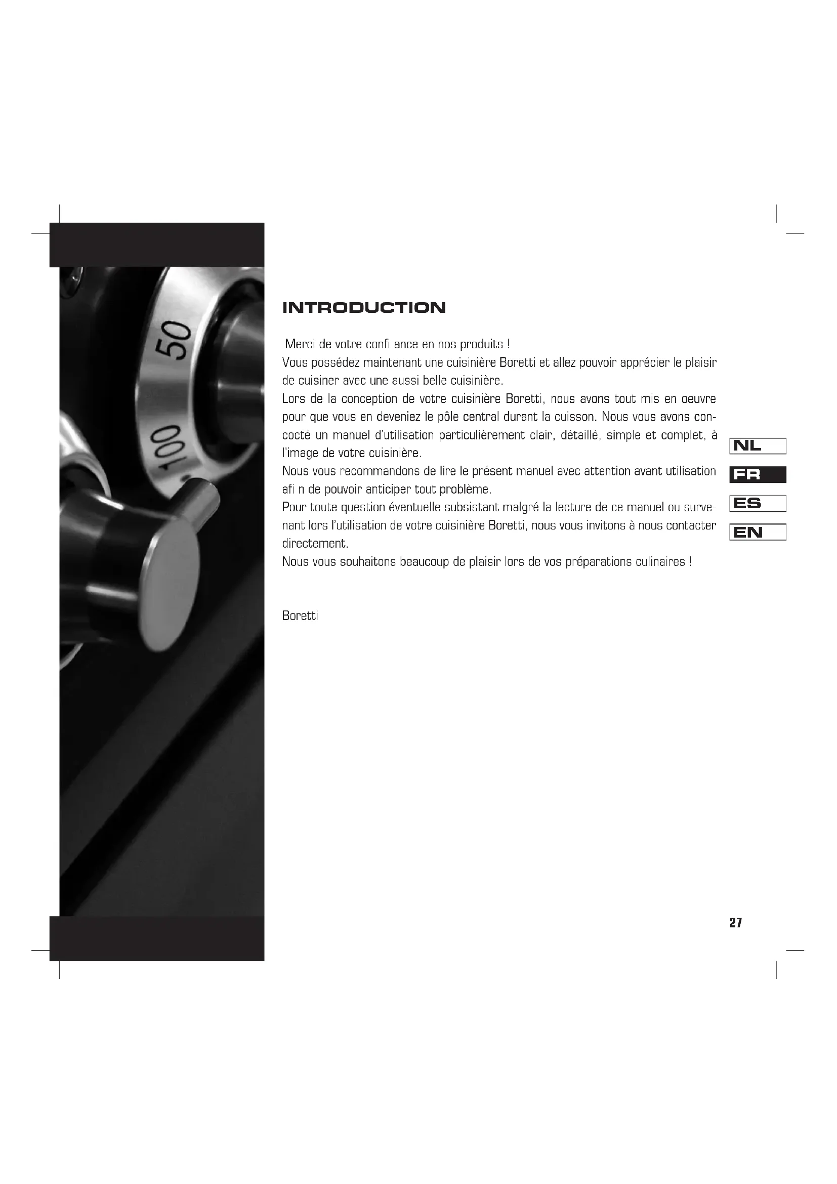 INTRODUCTION Merci de votre confi ance en nos produits ! Vous possédez maintenant une cuisinière Boretti et allez pouvoir apprécier le plaisir de cuisiner avec une aussi belle cuisinière. Lors de la conception de votre cuisinière Boretti, nous avons tout mis en oeuvre pour que vous en deveniez le pôle central durant la cuisson. Nous vous avons con- cocté un manuel d’utilisation particulièrement clair, détaillé, simple et complet, à l’image de votre cuisinière. Nous vous recommandons de lire le présent manuel avec attention avant utilisation afi n de pouvoir anticiper tout problème. Pour toute question éventuelle subsistant malgré la lecture de ce manuel ou surve- nant lors l’utilisation de votre cuisinière Boretti, nous vous invitons à nous contacter directement. Nous vous souhaitons beaucoup de plaisir lors de vos préparations culinaires ! Boretti28 Index Introduction À l’usage de l’installateur 29 – Informations générales concernant le montage – Raccordement électrique – Raccordement au gaz Avant la mise en service 31 – Consignes de sécurité – Dispositions concernant l’environnement – Nettoyage avant la première utilisation Fonctionnement de l’horloge LCD et programmation 33 – Réglage de l’heure – Commande manuelle – Réglage du signal sonore – Minuterie – Fonctions de cuisson automatique Fonctionnement et programmation de l’horloge LCD du four au gaz 35 – Réglage de l’heure – Réglage de la minuterie – Réglage du signal sonore Fonctionnement de l’horloge analogique programmable 36 – Réglage de l’heure – Commande manuelle – Minuterie – Cuisson automatique Explications concernant l’usage du four 37 – Fonction des différentes fonctions du four – Démarrage rapide (Quickstart) – Four gril – Utilisation d’un tournebroche – Refroidissement de la carcasse du four – Démontage de la porte du four – Démontage de la vitre du four – Démontage de l’intérieur du four – Nettoyage des parois intérieures du four – Utilisation du thermomètre de cuisson intérieur – Plaque réfractaire à pizza Explications concernant le four ventilé au gaz 41 – Allumage du four au gaz – Gril dans le four au gaz – Ventilateur dans le four au gaz Plan de cuisson 43 – Brûleurs au gaz, généralités – Brûleur pour wok – Le Fry-Top – Nettoyage du Fry-Top – La plaque coupe feu – Réglage des brûleurs au gaz – Plaque de gril en fonte – Nettoyage du plan de cuisson – Plan de cuisson en céramique Caractéristiques techniques 47 – Tableau pour le thermomètre de cuisson intérieur – Résolution des problèmes – Schémas de raccordement – Puissances et valeurs29