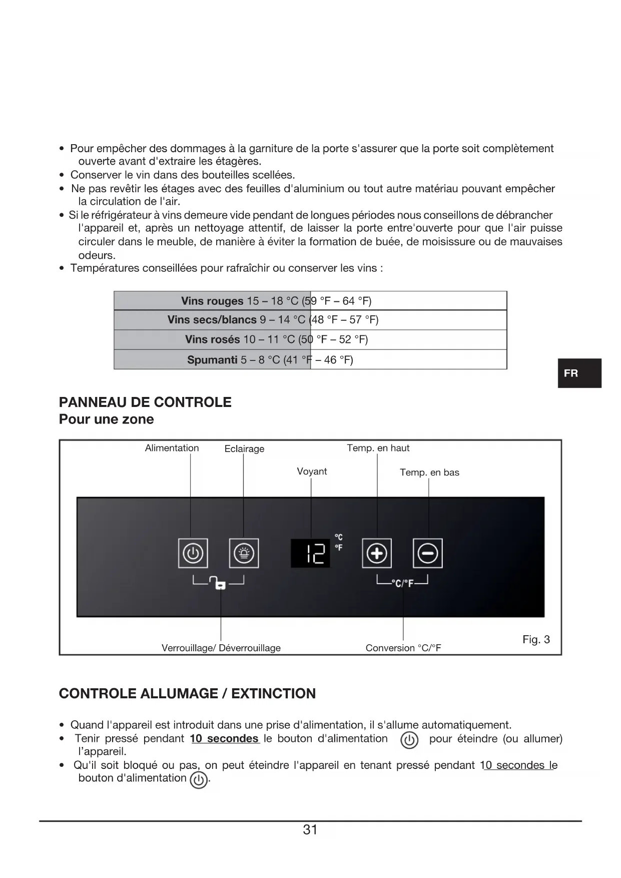 Pour une zone Fig. 3 Alimentation Verrouillage/ Déverrouillage Conversion °C/°F Eclairage Voyant Temp. en haut Temp. en bas